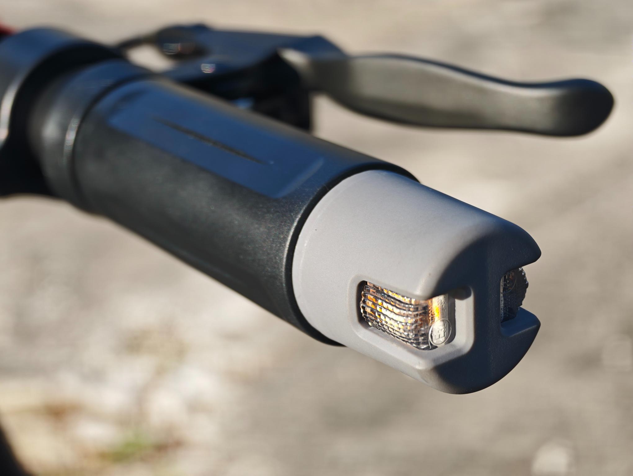 Die Beleuchtung (LED-Scheinwerfer vorn, dauerhaftes Rück-/Bremslicht hinten) ist extrem stark. Die Blinker sind bei der DE-Version in den Lenkerenden integriert. Eine blaue Beleuchtung reagiert zudem beim Bremsen.