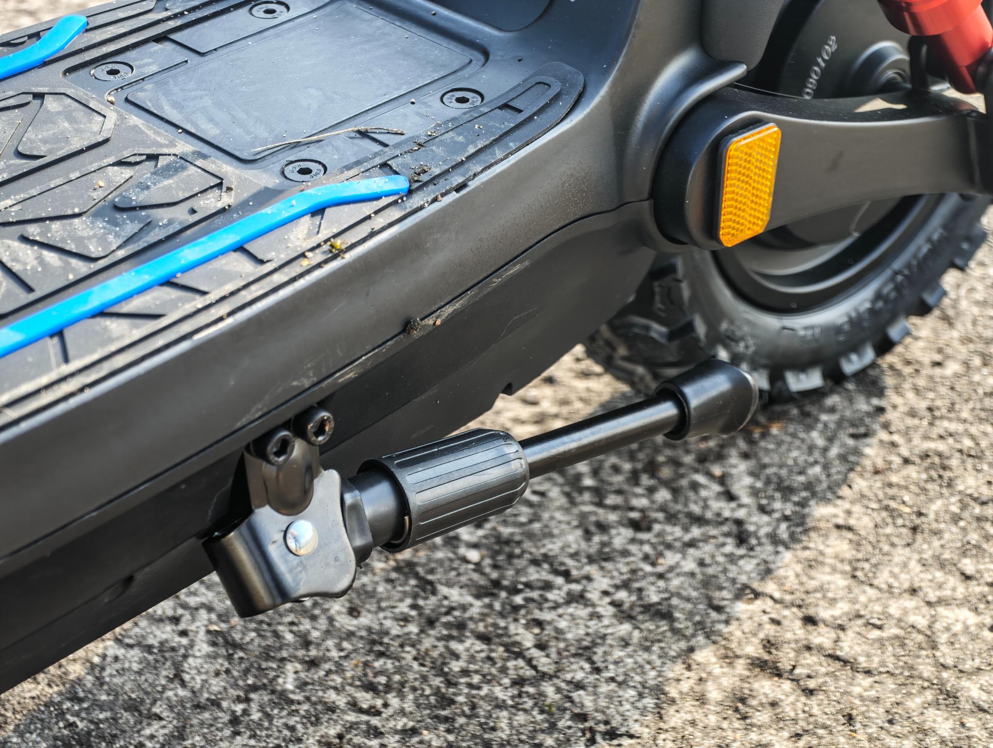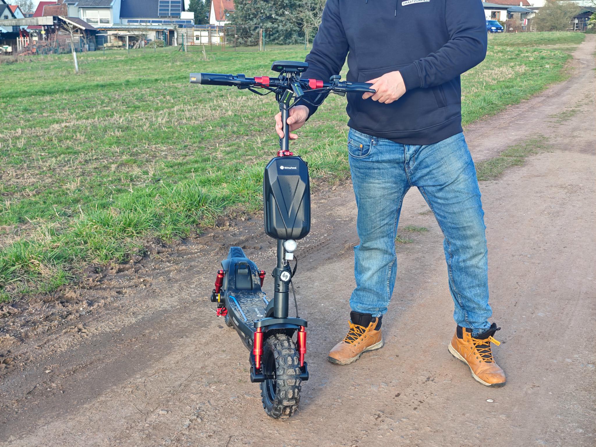 Optisch macht der GT2 ordentlich was her. Mit ausgeklappten Abmessungen von 1220 x 670 x 1270 Millimeter und einer massiven Trittbretthöhe von 22 Zentimeter wirkt er wie ein kleiner Panzer auf zwei Rädern. Die Verarbeitungsqualität ist auf den ersten Blick überzeugend, die Lenkstange ist absolut wackelfrei und extrem stabil.