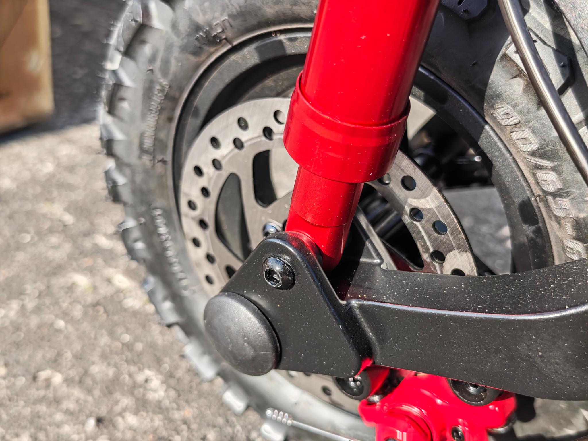 Daher haben wir gerätselt, ob die wuchtigen roten Stoßdämpfer an der Front nur Fake-Attrappen sind. Wir können bestätigen: Die 4-stufige Doppelfedergabel bewegt sich physisch! Allerdings ist sie extrem straff abgestimmt. Sie schlägt zwar selbst bei 90 Kilogramm Fahrergewicht nicht durch, schluckt feine Unebenheiten auf der Straße aber längst nicht so geschmeidig weg, wie die Optik es verspricht. Für Kopfsteinpflaster reicht es aber aus, womit eine Alltagstauglichkeit auch in der Stadt gegeben ist.