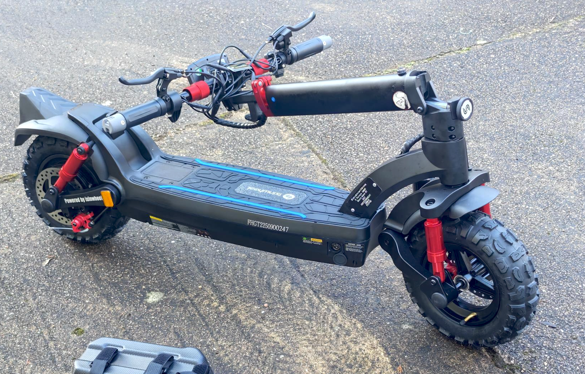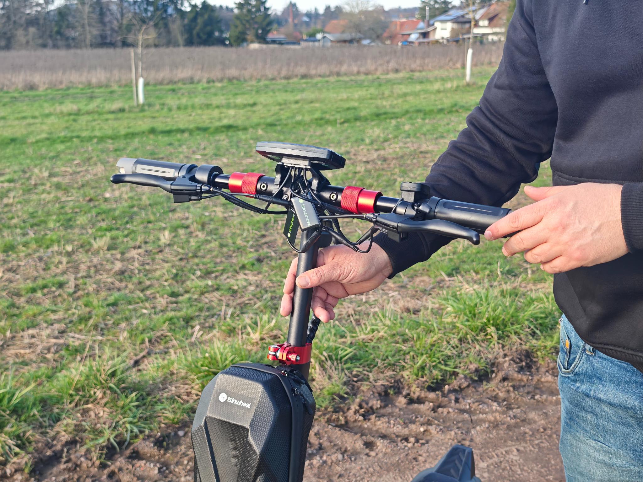 Aber hier kommt auch ein Kritikpunkt: Das Gewicht und der Klappmechanismus. Mit einem Leergewicht von stolzen 24,7 Kilogramm ist das Teil verdammt schwer. Treppensteigen macht damit absolut keinen Spaß und ist für zierliche Personen auch gar nicht möglich. Zudem ist der Klappmechanismus unergonomisch gelöst. Um den Scooter zusammenklappen zu können (gefaltet: 1220 x 220 x 560 Millimeter), müsst ihr zwingend die Höhe der Lenkstange verstellen.