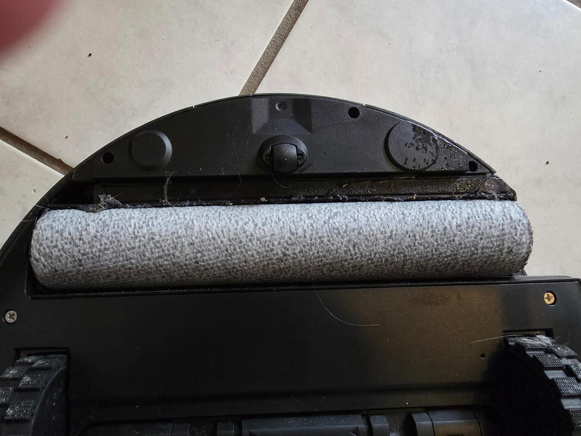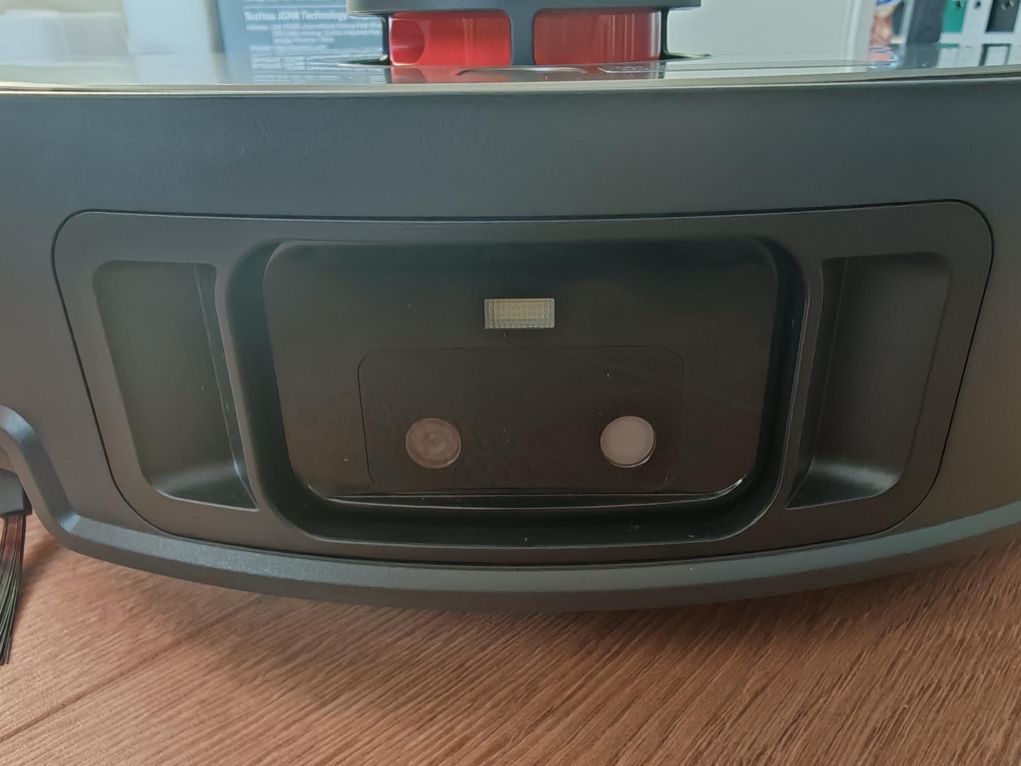 Durch die Rotation des einzelnen Arms werden Steinchen oder feiner Sand oftmals vom Saugschacht wegkatapultiert. Der Abstand zwischen Seitenbürste und Saugschacht ist zu groß. Dazu hat der Hersteller eine Gummilippe auf der Unterseite installiert, die wahrscheinlich den Luftzug in Richtung Saugschacht steuern soll. Allerdings ist der Abstand zum Boden zu groß, um einen positiven Effekt zu erzielen.
