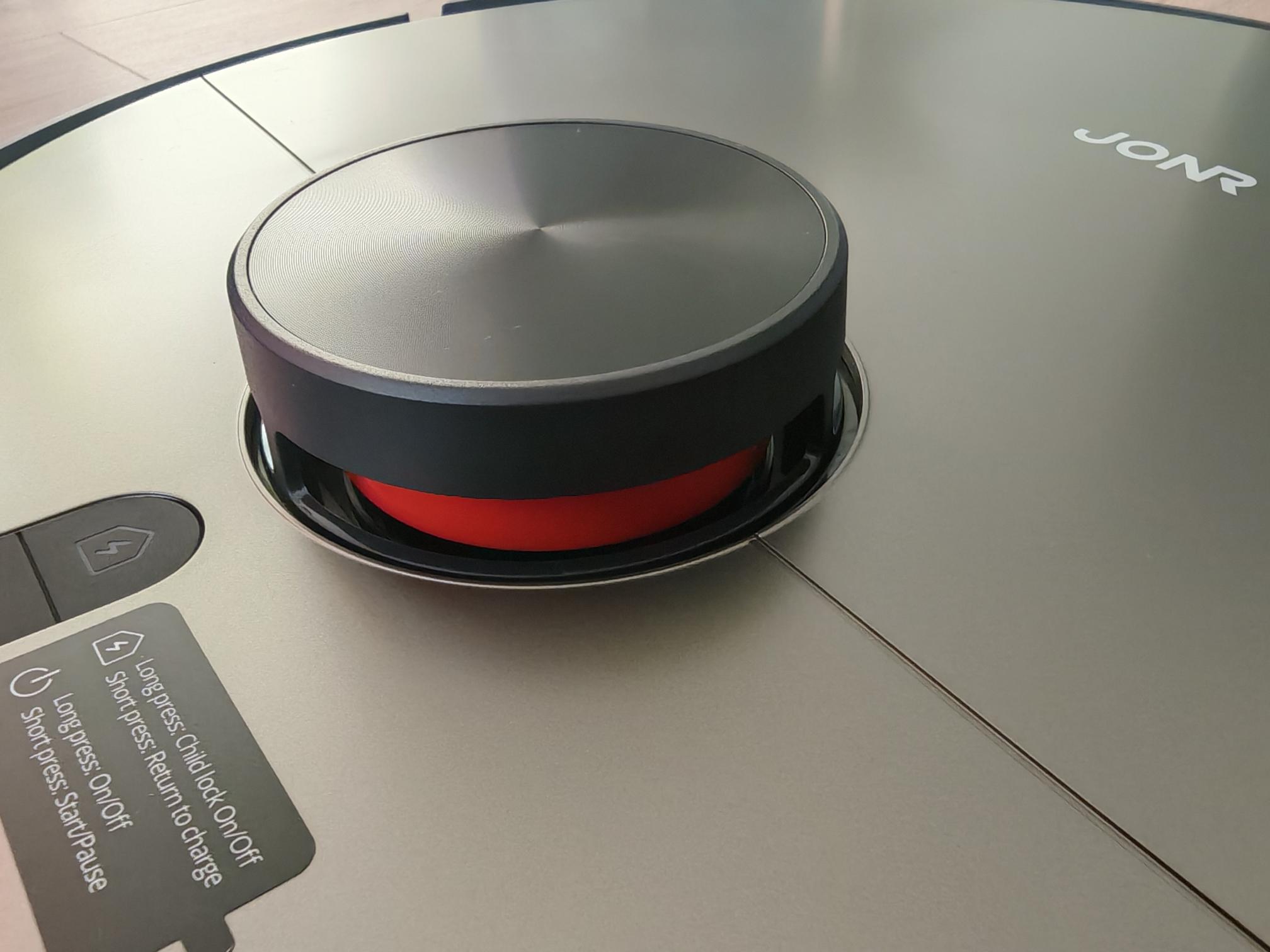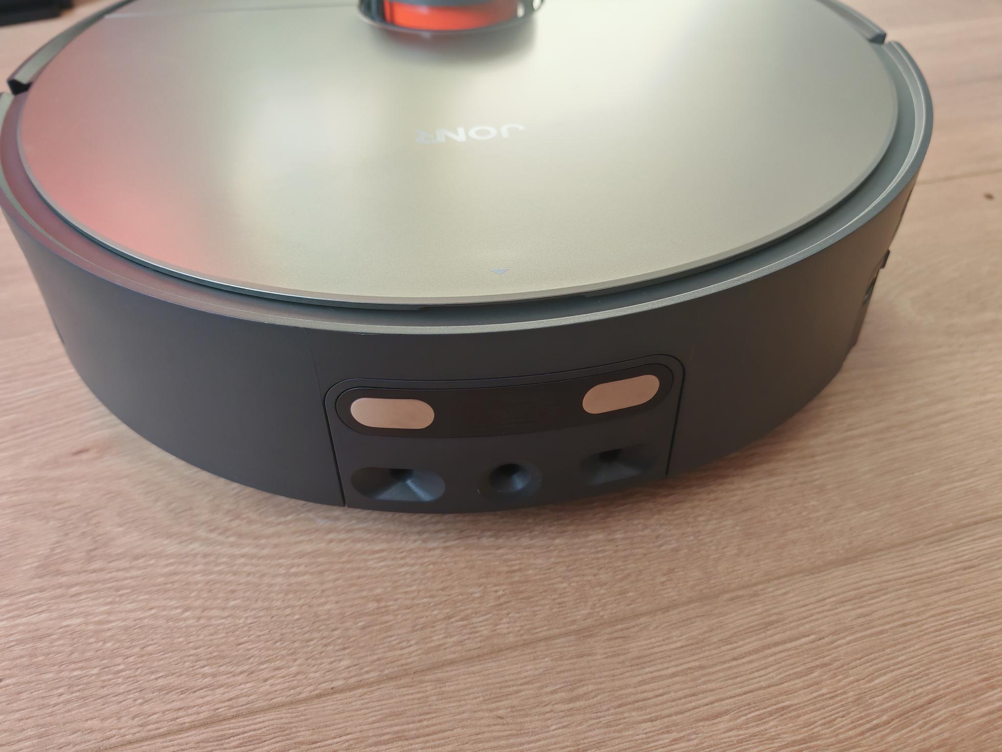 Der JONR X9 Pro ist unspektakulär gestaltet und mit 350mm kreisrund. Auch die Höhe von 110mm inklusive des Laserturms fällt gewöhnlich aus. Der Turm ist fest montiert, dadurch seid ihr bei flachen Möbelstücken oder Durchfahrten eingeschränkt. Die messingfarbene Abdeckung lockert das Design auf. Der verwendete Kunststoff ist einfach, genau wie die Konstruktion. Die Abdeckung, unter der sich der interne Staubbehälter befindet, ist nur durch einfache Plastiknasen gesichert. Das setzt sich beim internen Staubbehälter fort, der einen günstigen Eindruck macht. Zudem wirkt der interne Staubfilter im Behälter eingequetscht. Zumindest ist eine Filtererkennung verbaut, und die zwei physischen Tasten ermöglichen auch ohne App den Zugriff auf die rudimentären Funktionen des JONR X9 Pro.
