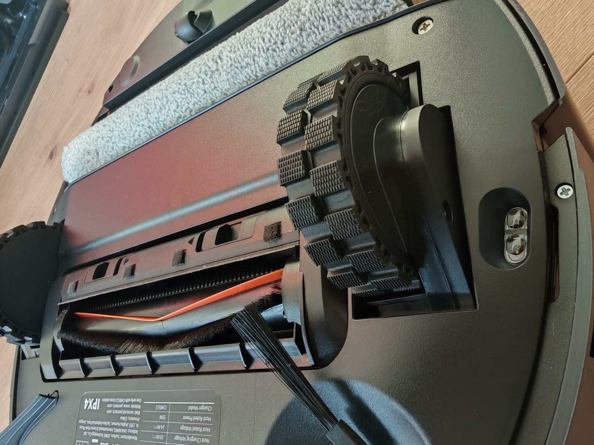 Viel spannender ist die Unterseite, wo uns statt zwei Pads eine 260mm breite Wischrolle erwartet. Der 155mm breite Absaugschacht wird von der rudimentären Seitenbürste unterstützt, die allerdings ausfahrbar ist. Ebenso kann die Wischrolle um rund 6cm ausgefahren werden, um eine besonders gute Randreinigung zu erzielen. Für Teppiche dagegen wird die Walze um 10mm angehoben. Die Bürste des JONR X9 Pro weicht optisch ab und soll – was allerdings viele Hersteller versprechen – mit Tierhaaren und langen Haaren wenig Probleme haben. So soll die Struktur der Bürste ein Einwickeln der Haare weitestgehend verhindern. Die Reinigungsbürste ist schwebend gelagert und kann sich unterschiedlichen Höhen anpassen. Vier Infrarotsensoren müssen als Absturzsicherung ausreichen. Die maximale Steighöhe des JONR X9 Pro beträgt 20mm. Insgesamt hinterlässt der Staubsaugerroboter einen befriedigenden Eindruck, lässt aber Raum für konstruktiv bessere Lösungen offen.