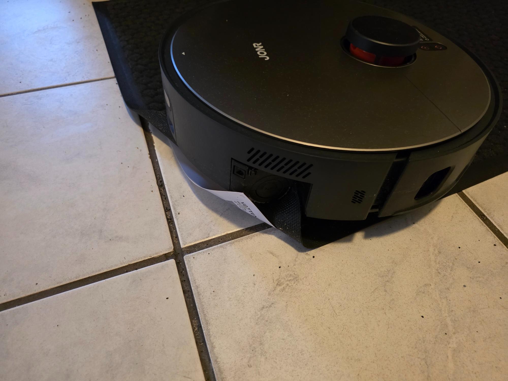 Wesentlich besser funktioniert die Wischfunktion des JONR X9 Pro. Hier profitiert er eindeutig von der Rolle, die den Wischpads überlegen ist. Dadurch erzeugt er ein gleichmäßiges Wischergebnis und entfernt leichten Schmutz gut. Zur Steigerung der Reinigungsleistung könnt ihr ein nichtschäumendes Reinigungsmittel verwenden. Einen separaten Reinigungstank wie einige Dreame-Produkte besitzt der Saugroboter nicht. Das Gerät fährt die Rolle je nach Situation aus, um die Randbereiche des Bodens zu erreichen. Das funktioniert ausgesprochen gut. Flache Fußmatten bereiten der Wischrolle jedoch Probleme: Während des Tests verhedderte sich gleich zweimal eine Fußmatte im Saugroboter. Für Teppiche könnt ihr die Wischwalze hingegen um 1cm anheben, um den Teppich nicht zu befeuchten. Die Erkennung von Teppichen war kein Problem, und das Anheben ist für Teppiche mit kurzem Flor ausreichend.