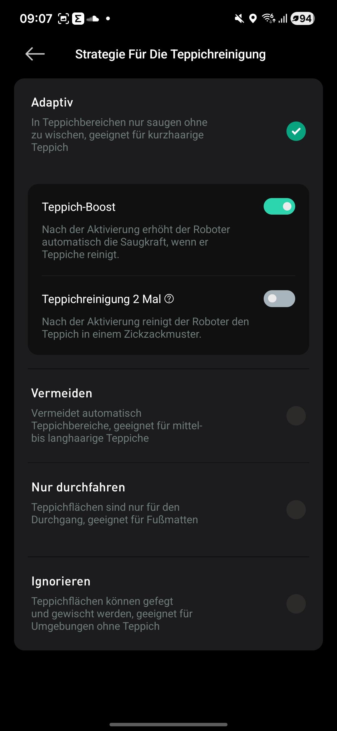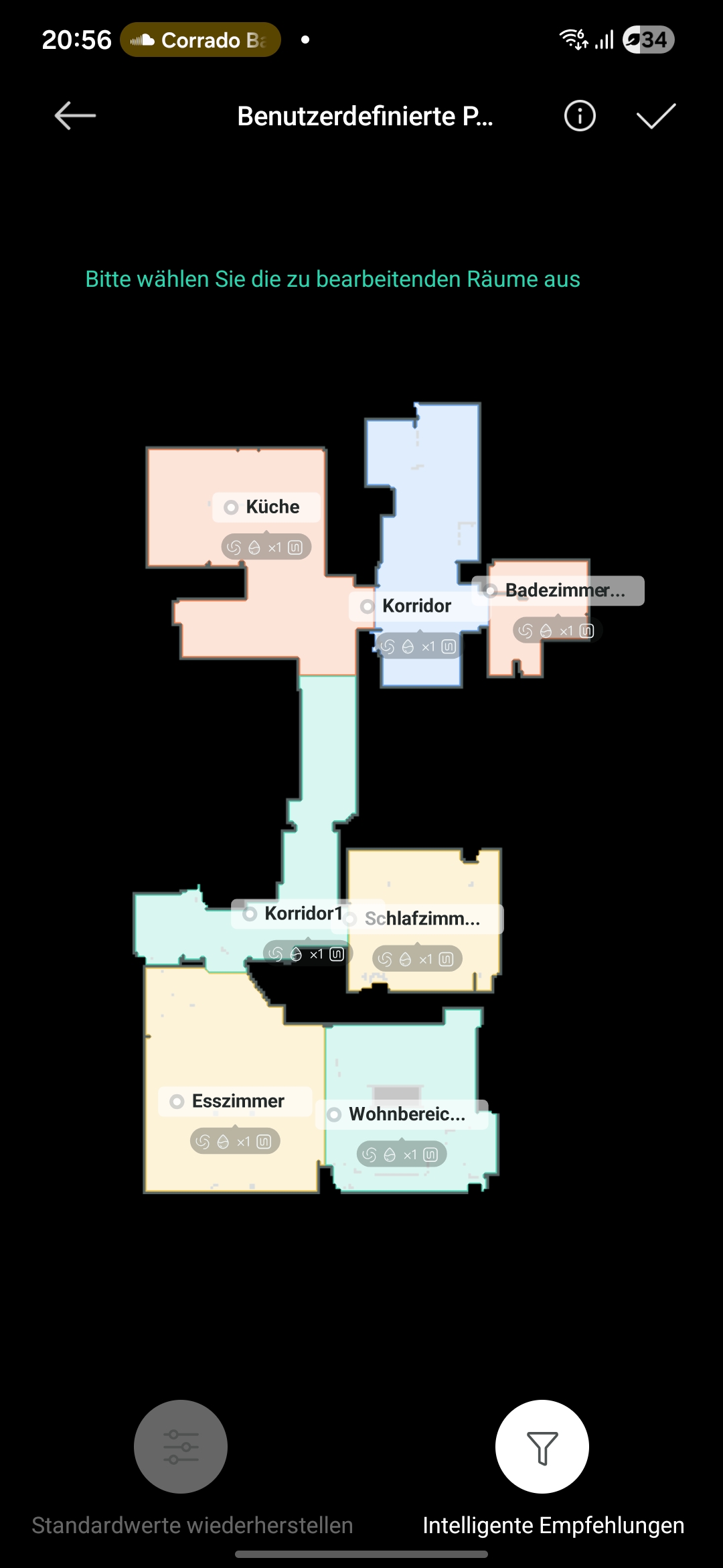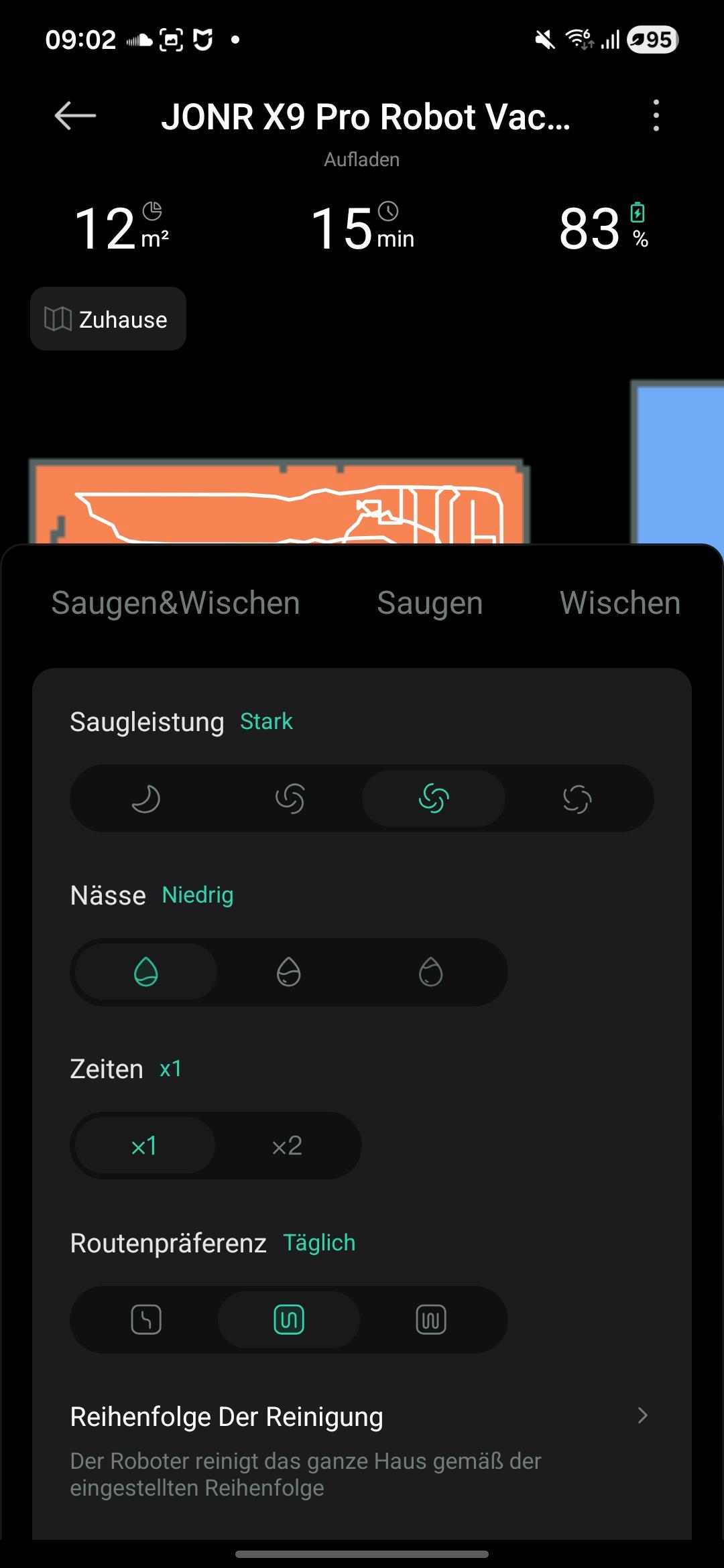 Einen intelligenten oder smarten Reinigungsmodus wie bei anderen Herstellern gibt es beim JONR X9 Pro nicht. Vor Beginn müsst ihr festlegen, ob ihr saugen, wischen oder die Kombination aus beidem wollt. Zusätzlich legt ihr die Intensität fest. Nach dem Erstellen einer Karte könnt ihr wählen zwischen: