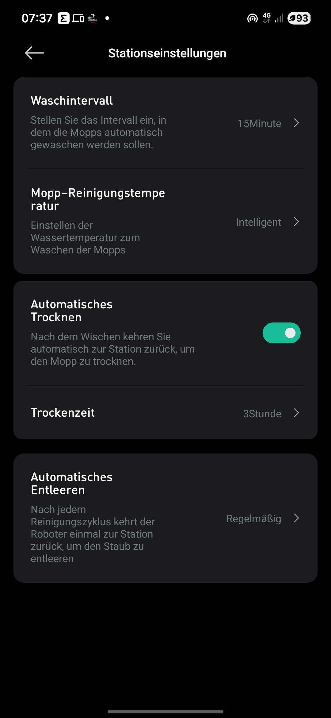 Zur Reinigung könnt ihr die Walze nach dem Entfernen der Verriegelung unkompliziert entnehmen. So erreicht ihr auch die Bereiche im Saugroboter. Im Gegensatz zu Wischpads ist diese nicht waschbar, sondern muss bei Bedarf komplett getauscht werden. Die Trocknungsdauer ist standardmäßig 3 Stunden und ausreichend. Die Servicestation erzeugt ausreichend heiße Luft zum Trocknen.