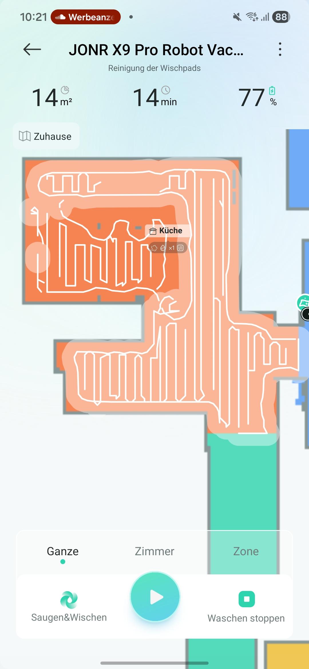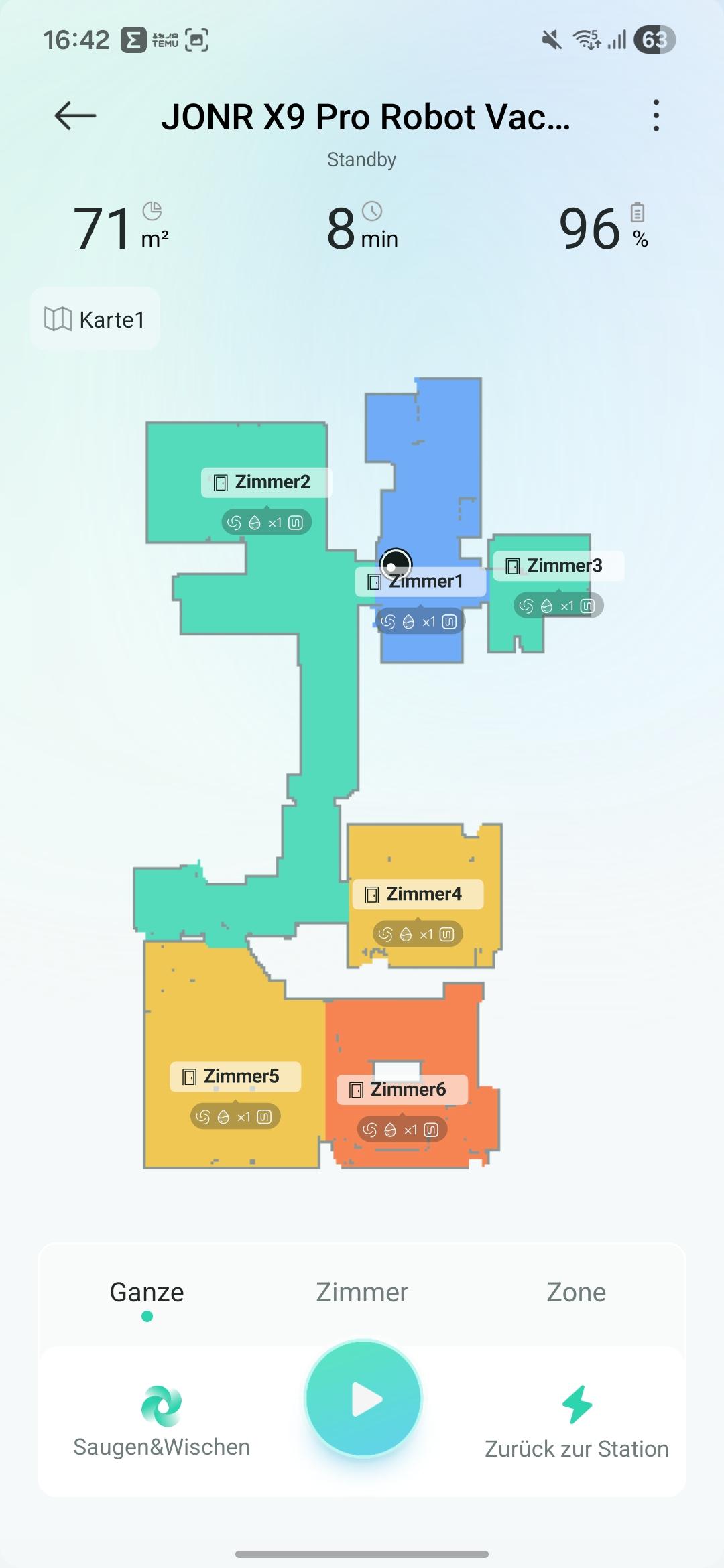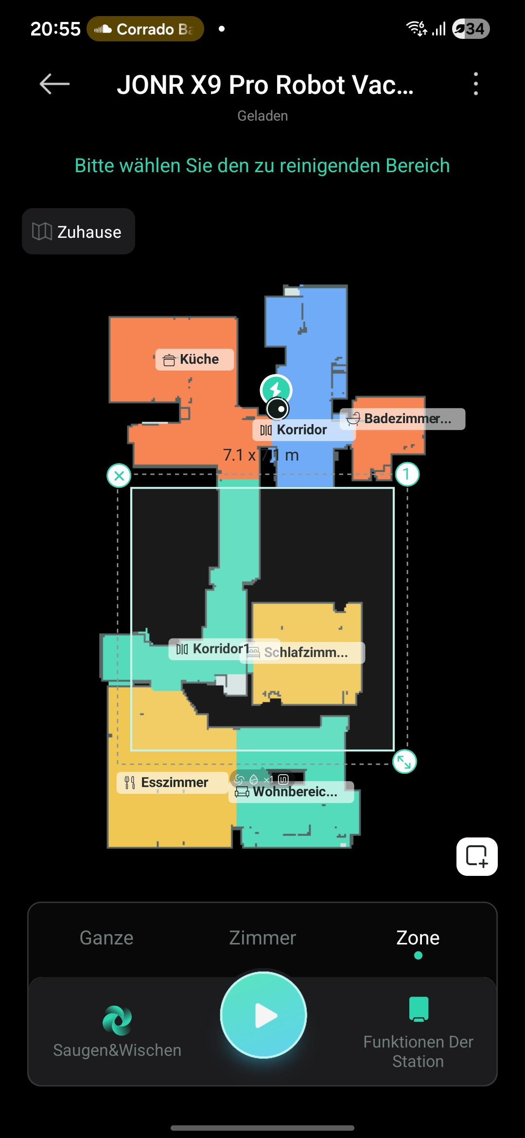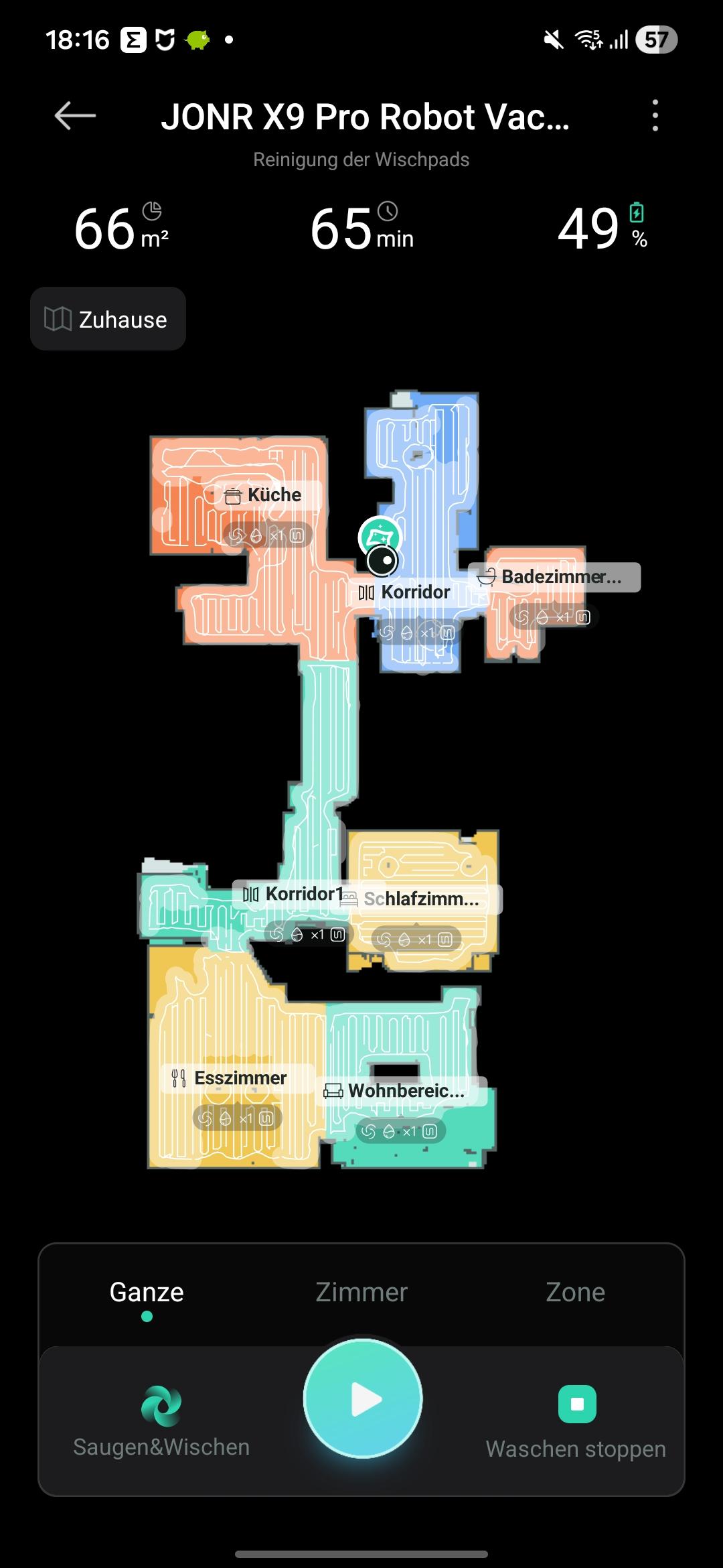 Vor dem ersten Reinigen ist das Erstellen einer Karte erforderlich. Alternativ lasst ihr den Roboter die Karte erstellen und gleichzeitig reinigen. Beides ist möglich. Für meine verwinkelten 65m² benötigt der JONR X9 Pro knapp 10 Minuten. In der App könnt ihr die Räume zuordnen und gegebenenfalls noch teilen. Eine automatische Zuordnung erfolgt nicht. Wichtig: Der Roboter lernt nicht dazu. Deshalb sind die Räumlichkeiten während der Kartierung möglichst freizuhalten. Andernfalls bleiben blinde Flecken im Haushalt, die der Roboter nicht reinigt. Falls nötig, könnt ihr No-Go-Zonen einrichten. Ebenso unterstützt das Gerät zwei Etagen, und die App fragt nach der Kartierung, ob eine oder zwei Etagen vorhanden sind.
