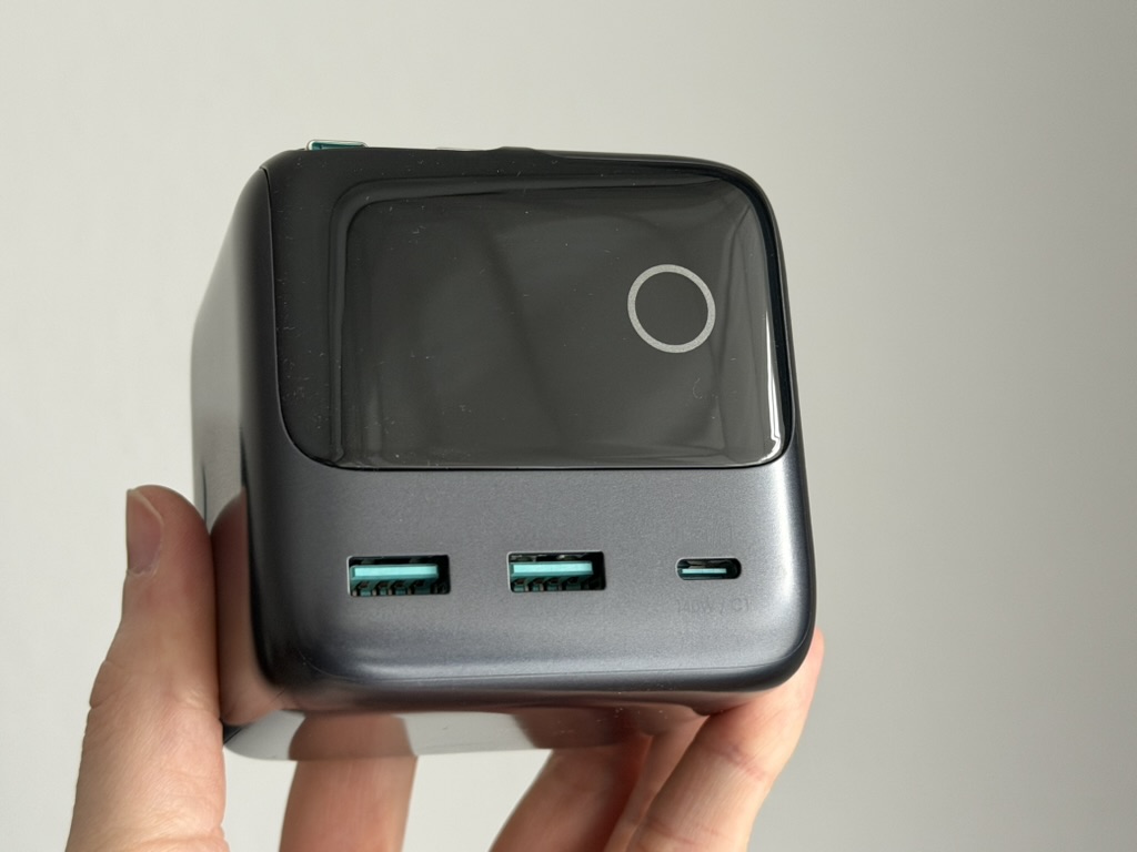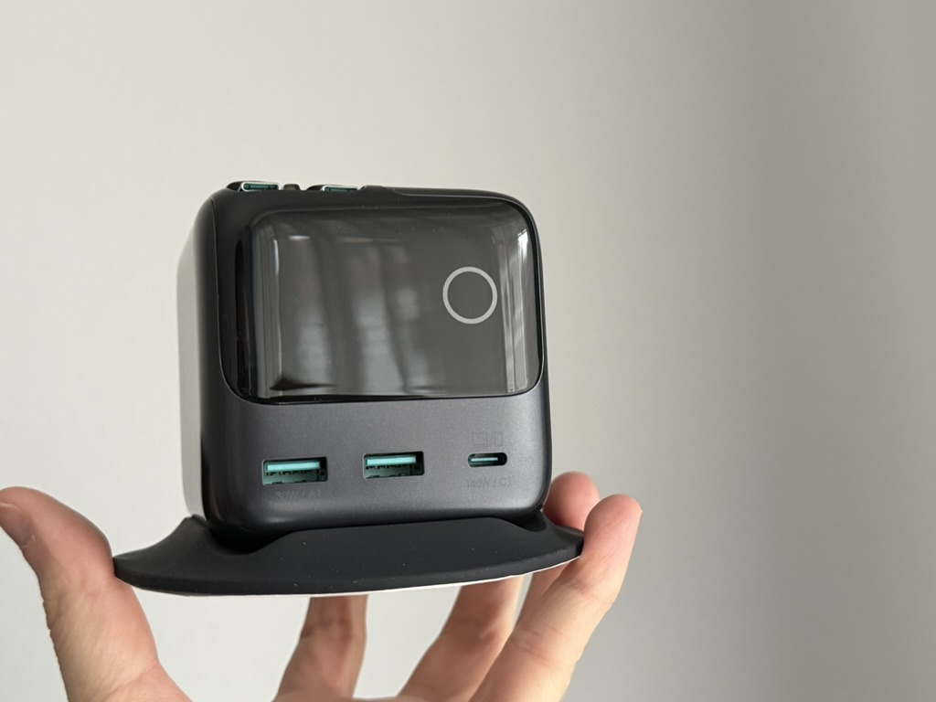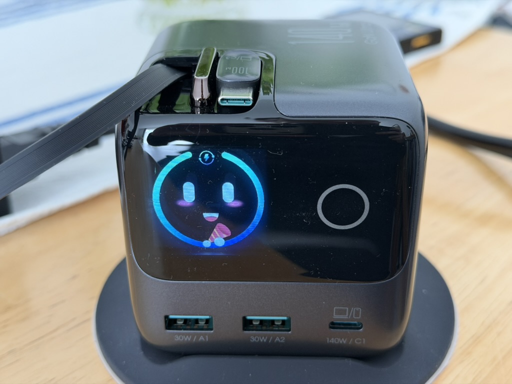 Das Display des Joyroom Podix 140W Desktop Charger ist nicht nur umfangreich, sondern auch vielseitig einsetzbar. Standardmäßig zeigt das Ladegerät die Gesamtleistung in Watt an. Über den Touchpoint könnt ihr euch jedoch auch durch verschiedene Seiten klicken, die zum einen die Leistung pro Port oder zum anderen animierte Emojis anzeigen. Über einen Doppelklick wechselt ihr zwischen den Emojis hin und her. Eine nette Spielerei, jedoch ohne echten Mehrwert. Über dreifaches Tippen auf den Touchpoint lässt sich das Display um 90 Grad im Uhrzeigersinn drehen. Dadurch richtet ihr den Charger flexibel aus. Wenn ihr die integrierten Kabel anstatt auf der Oberseite lieber links oder rechts nutzen möchtet, dreht ihr das Ladegerät einfach um. Haltet ihr den Touchpoint länger gedrückt, könnt ihr das Display auch deaktivieren.