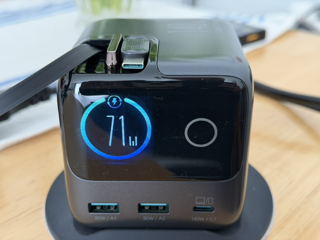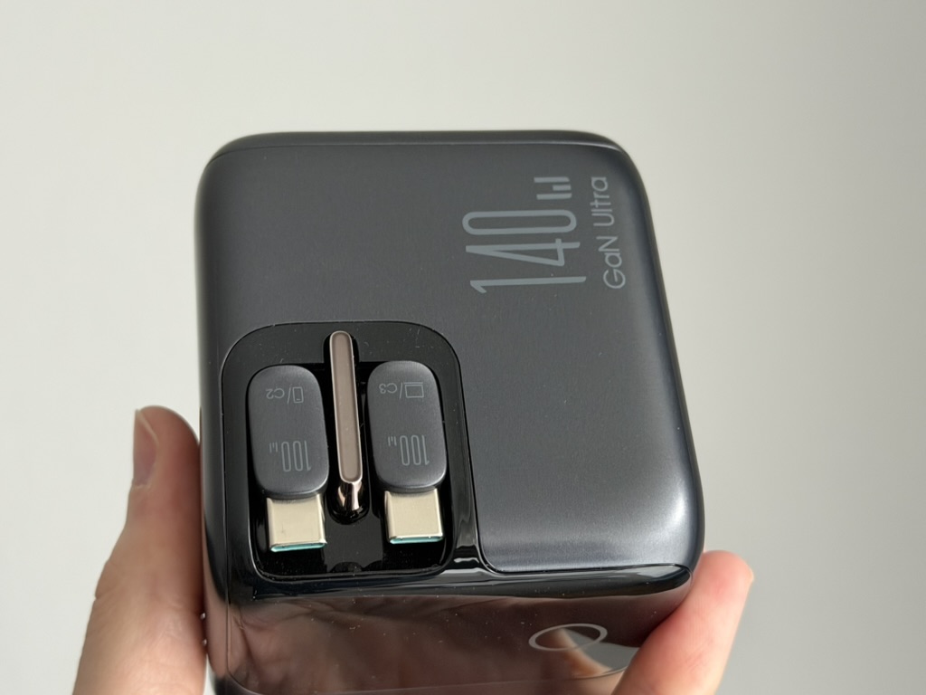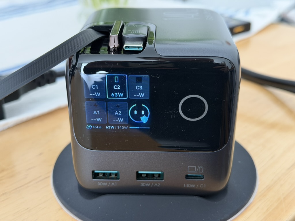 Die Gesamtleistung des Ladegeräts beläuft sich auf 140W. Jedoch kann nur der USB-C-Port (C1) auch einzeln 140W ausgeben. Die beiden integrierten USB-C-Kabel (C2 & C3) sind auf 100W beschränkt, während die beiden USB-A-Ports (A1 & A2) jeweils 30W liefern.