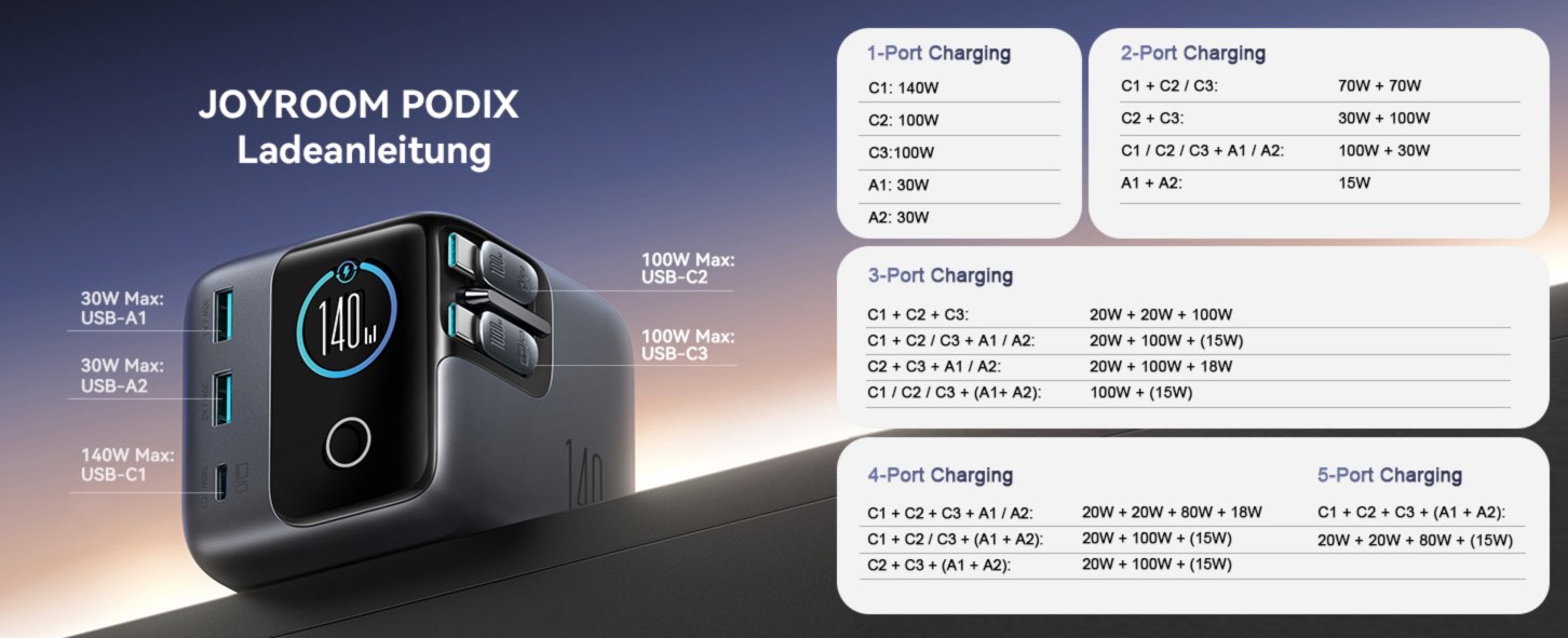 Leistungswerte des Joyroom Podix 140W Chargers