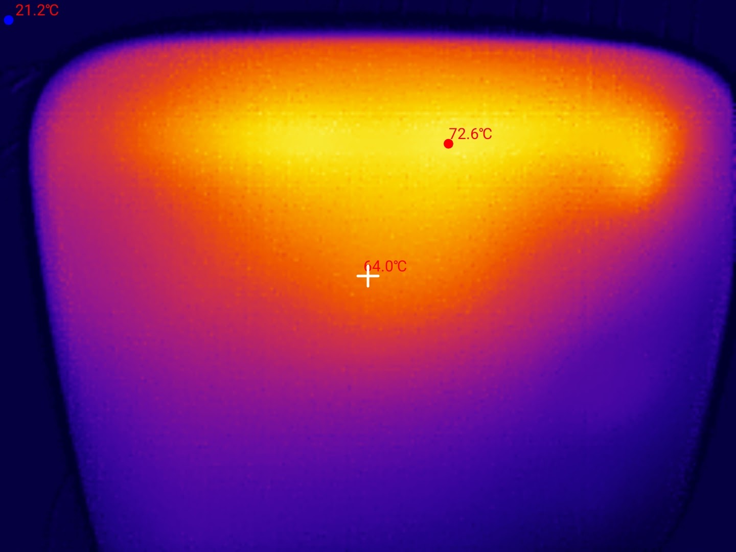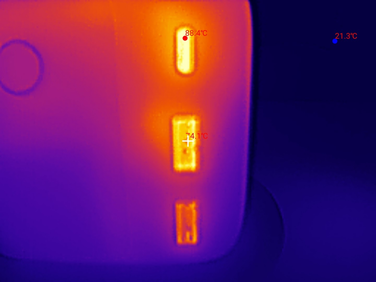 Die Temperatur-Werte liegen bei dieser extremen Dauerlast bei bis zu 72°C am äußeren Gehäuse und 88°C an den offenen Ports. Das sind zwar vertretbare und für das Ladegerät noch unproblematische Temperaturen, allerdings hat uns die hohe Wärmeentwicklung dennoch überrascht. Mit dann nutzbaren 100W konnte das Ladegerät aber konstant weiterladen, woraufhin die Temperaturen im weiteren Verlauf wieder sanken.