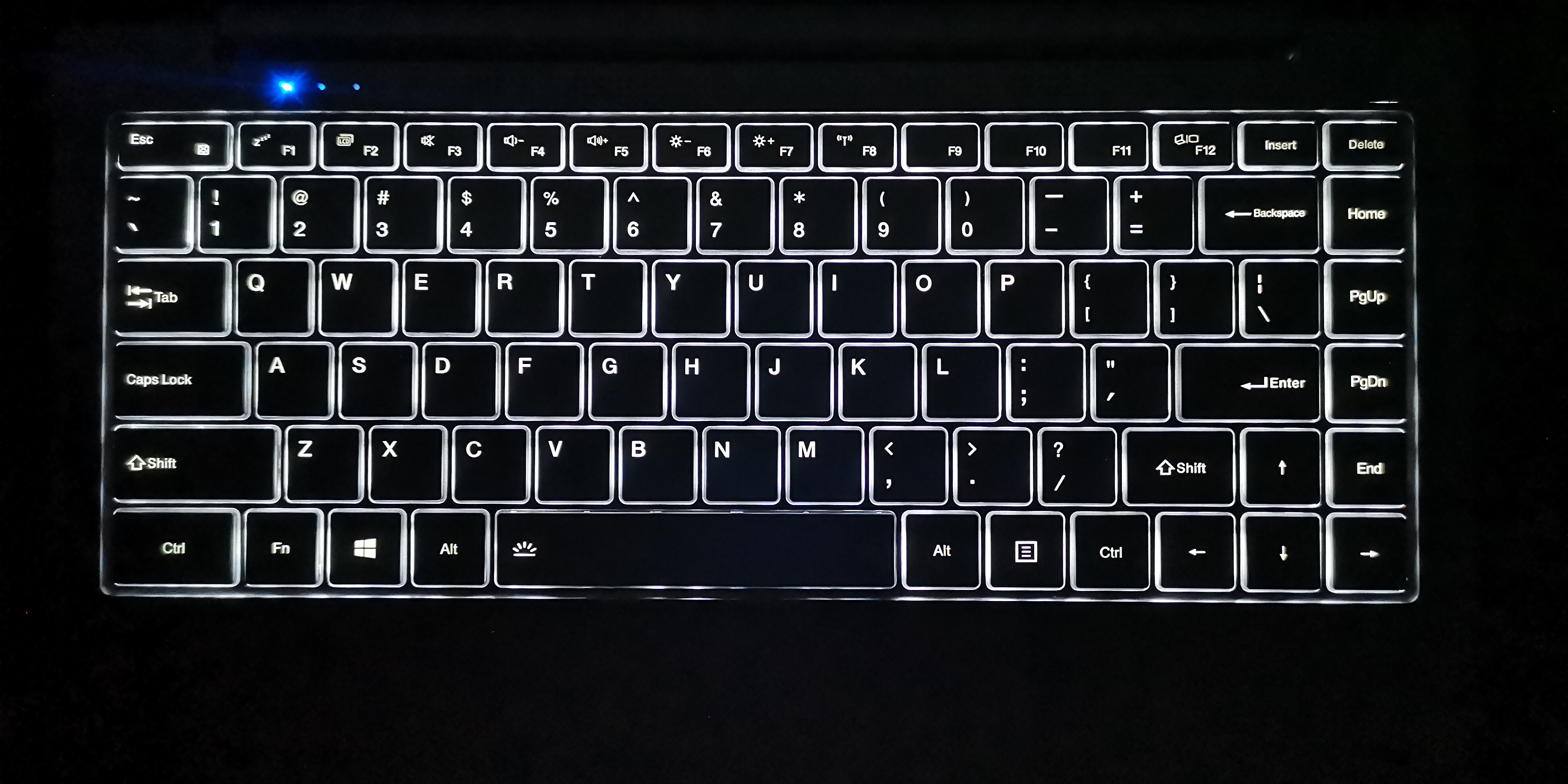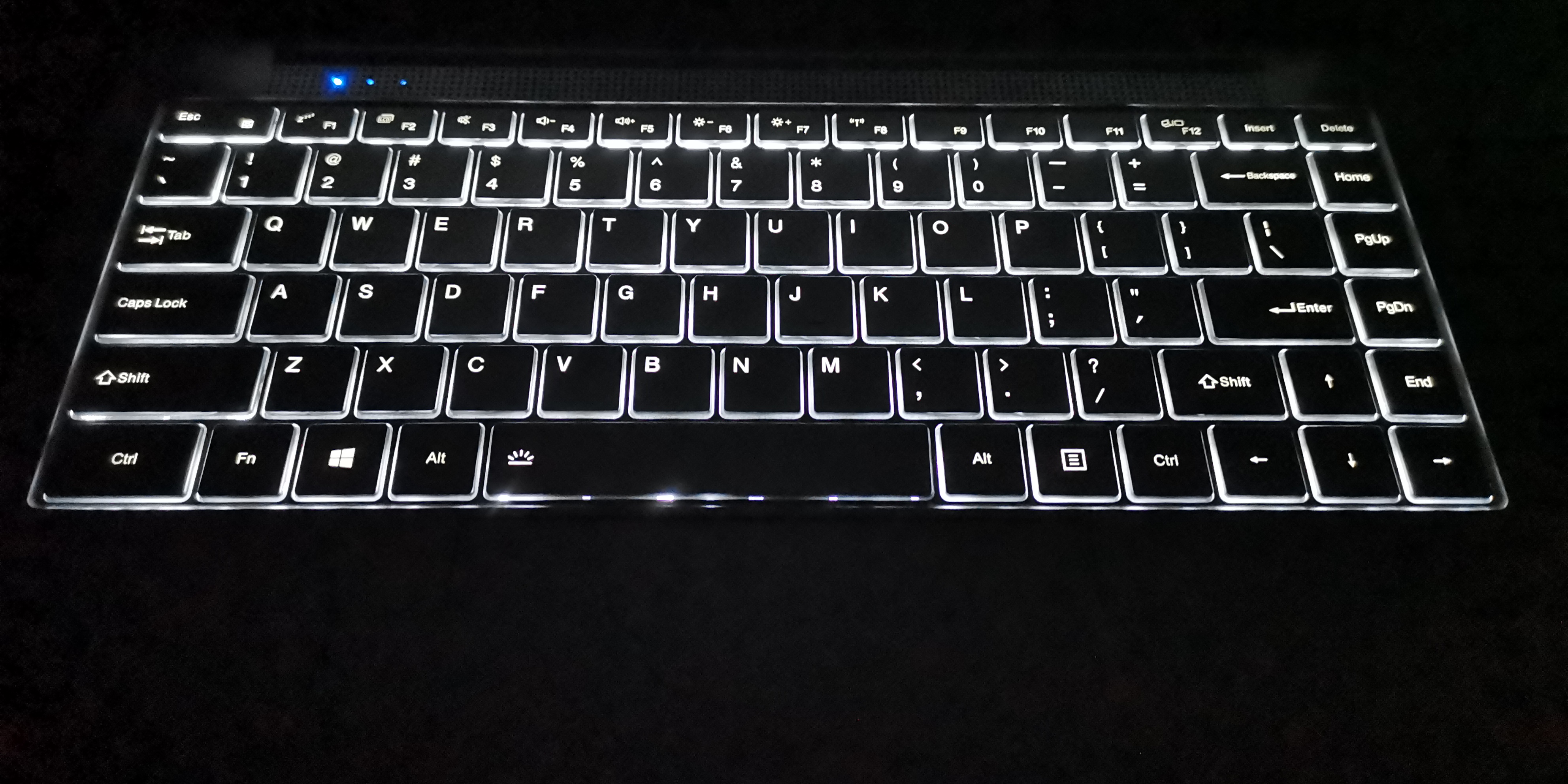 Jumper verbaut im X4 Pro eine Chiclet-Tastatur im QWERTY-Layout, die sich fast über die komplette Fläche bis zu den Rändern erstreckt. Die Größe der einzelnen Standard-Tasten beträgt 1,6 x 1,7 cm. Erfreulicherweise sind die Pfeiltasten genauso groß. Nur die obigen Funktionstasten (F-Keys) sind etwas schmaler (1,0 cm). Im Gegensatz zum X4 sind die Tasten nicht mehr flach, sondern besitzen eine spürbare Vertiefung. Zwar bestehen die Tasten, wie auch zuvor, wieder aus Kunststoff, aber sie wirken auf den ersten Eindruck nicht so hochwertig, wie die des EZBook X4.