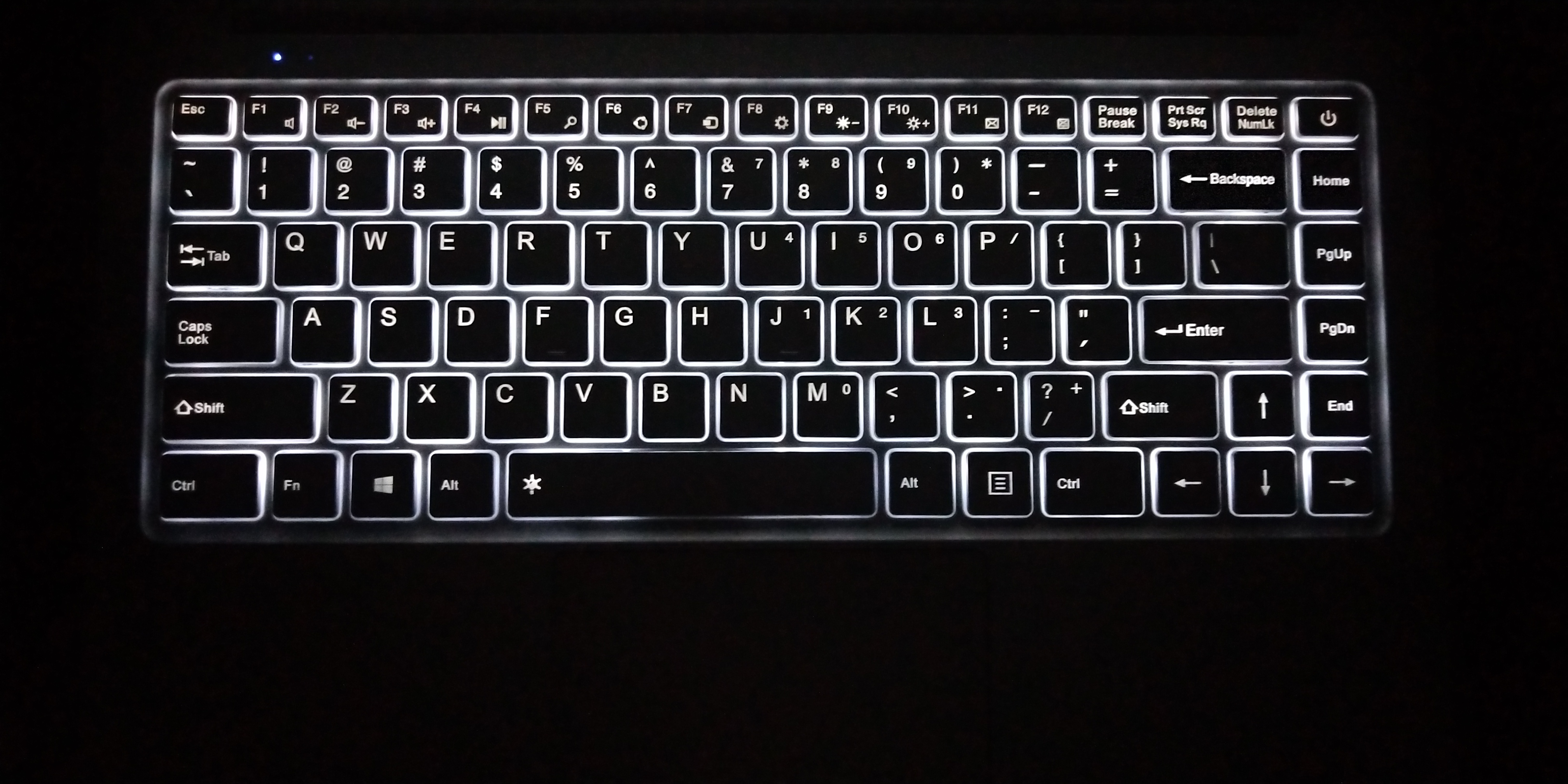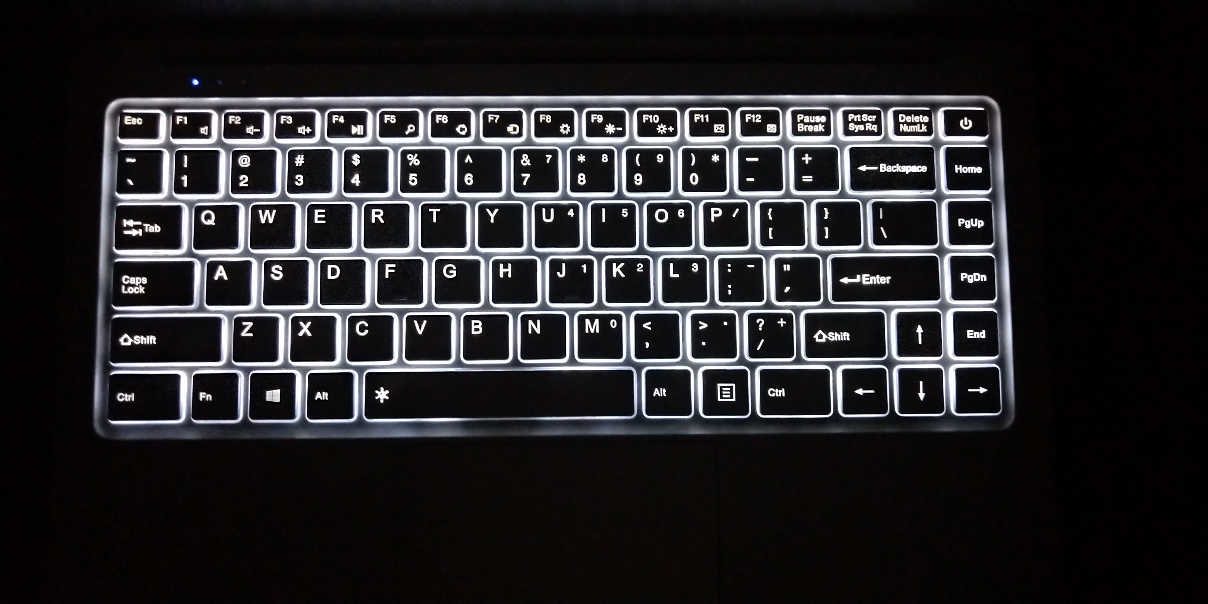 Kommen wir zu einem weiteren Schmankerl des X4. Die Chinesen integrieren, vermutlich mit stolzer Brust, eine beleuchtete Tastatur im Ultrabook. Die Beleuchtung ist in 2 Stufen dimmbar. Via Tastenkombination „Fn + Leertaste“ geht dem Ultrabook ein Licht auf. Bei erneuter Kombination wird das Licht nochmals einen Tick heller. Bei der 3. Tastenkombination ist das Licht wieder deaktiviert. Beim 3 Pro sind die Tasten noch in Schwarz gehalten mit weißen Buchstaben, allerdings auch ohne Beleuchtung. Beim X4 sind die Tasten in Gerätefarbe, also in grau, gehalten. Das sieht in der Tat echt verdammt gut aus. Mit der Beleuchtung ist nun auch das Arbeiten sowohl bei schlechten Lichtverhältnissen als auch bei Nacht möglich.