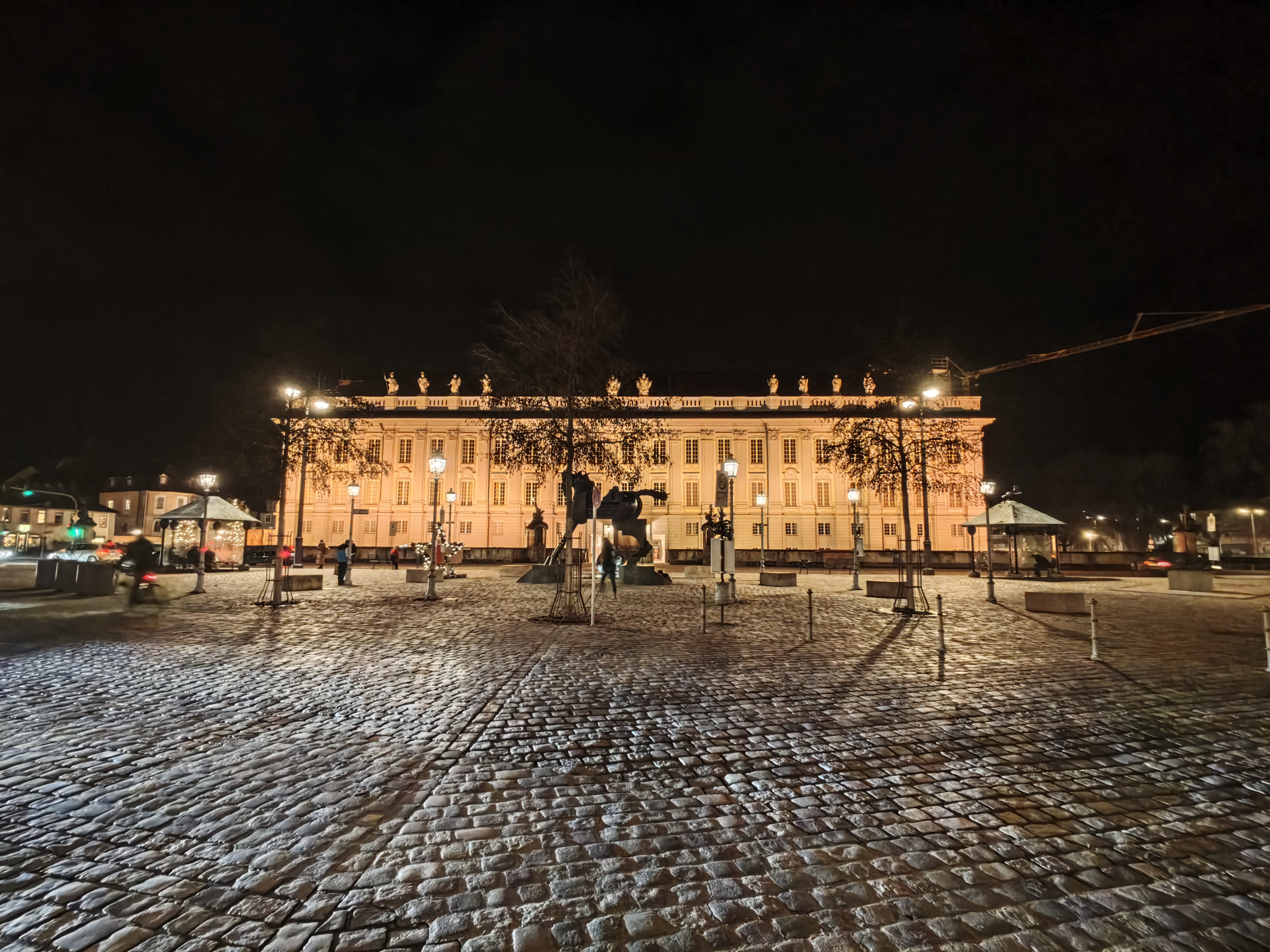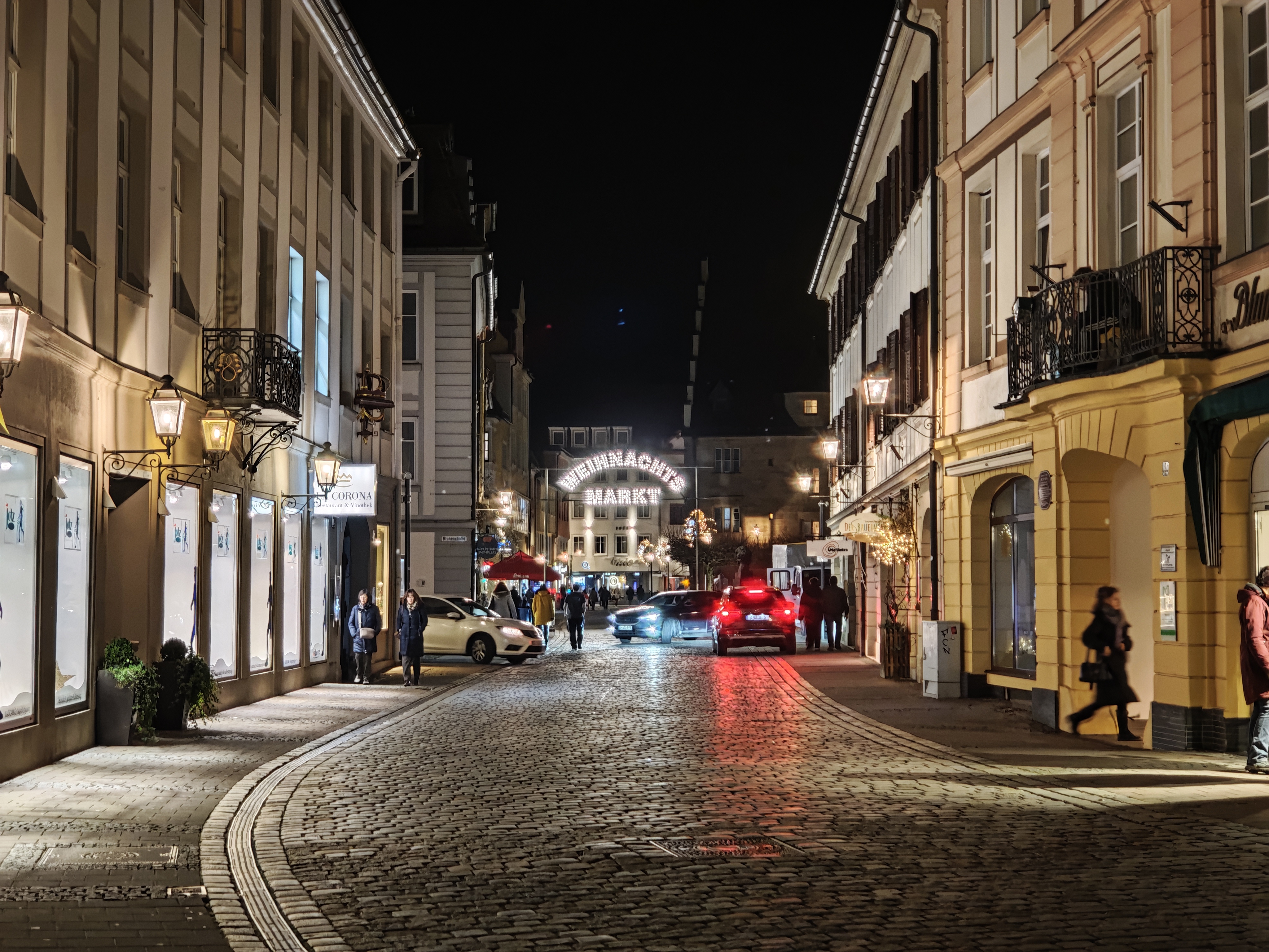 Würde die Aufnahme des Pixel 10 Pro nicht danebenliegen, fiele der Gelbstich des Xiaomi 17 gar nicht so sehr ins Auge. Dazu glänzen die Pflastersteine unnatürlich in der Nacht. So wirkt die Aufnahme insgesamt unausgewogen, auch wenn der Fokus und die grundsätzliche Helligkeit stimmen. Von solchen Problemen ist der Sensor des Google-Smartphones nicht betroffen und zeichnet eine astreine Aufnahme ohne Bildrauschen mit einer richtigen Betonung verschiedener Elemente.