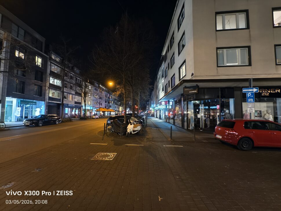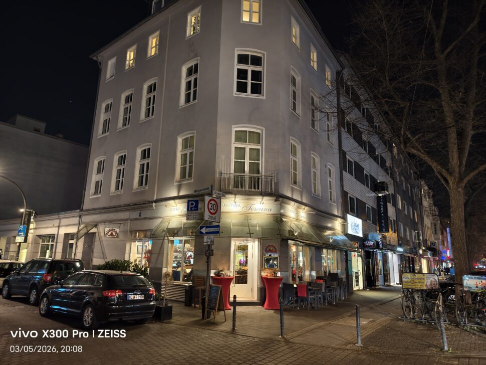 Die Nachtaufnahmen der Zoom-Kamera halten das gleiche hohe Niveau wie am Tag. Beide Geräte binden Lichtquellen gut in die Bilder ein. Der Dynamikumfang ist auf beiden Seiten sehr hoch und auch in der Vielzahl der Details gibt es keine Unterschiede. So ist es wieder die Kantenglättung, die für das Vivo X300 Pro spricht.
