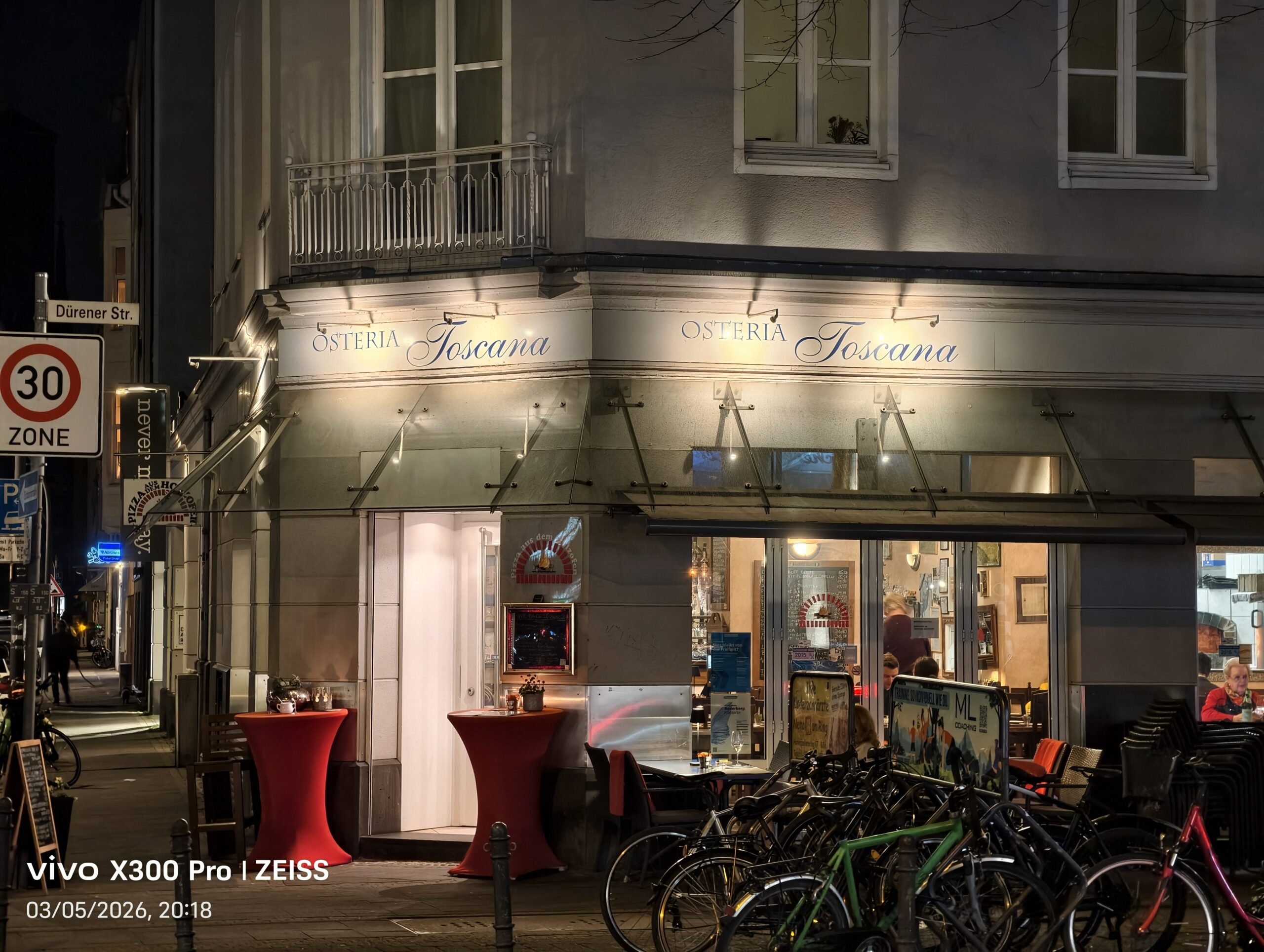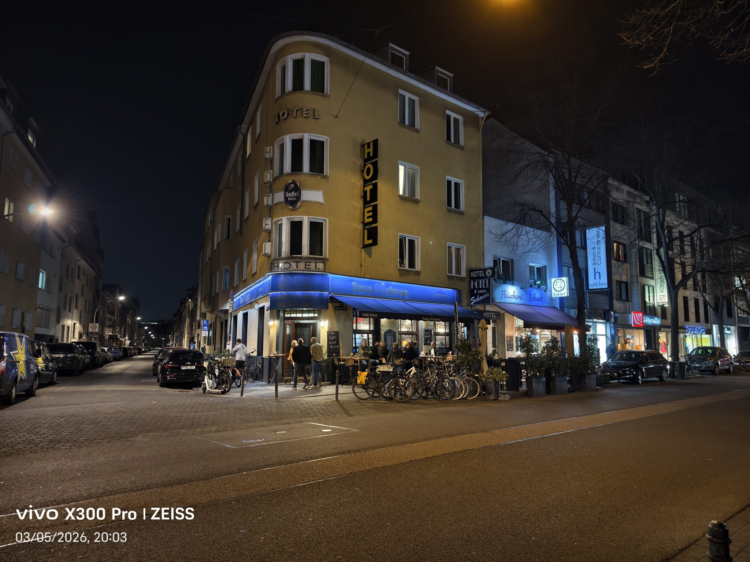 Die Nachtaufnahmen der Zoom-Kamera halten das gleiche hohe Niveau wie am Tag. Beide Geräte binden Lichtquellen gut in die Bilder ein. Der Dynamikumfang ist auf beiden Seiten sehr hoch und auch in der Vielzahl der Details gibt es keine Unterschiede. So ist es wieder die Kantenglättung, die für das Vivo X300 Pro spricht.