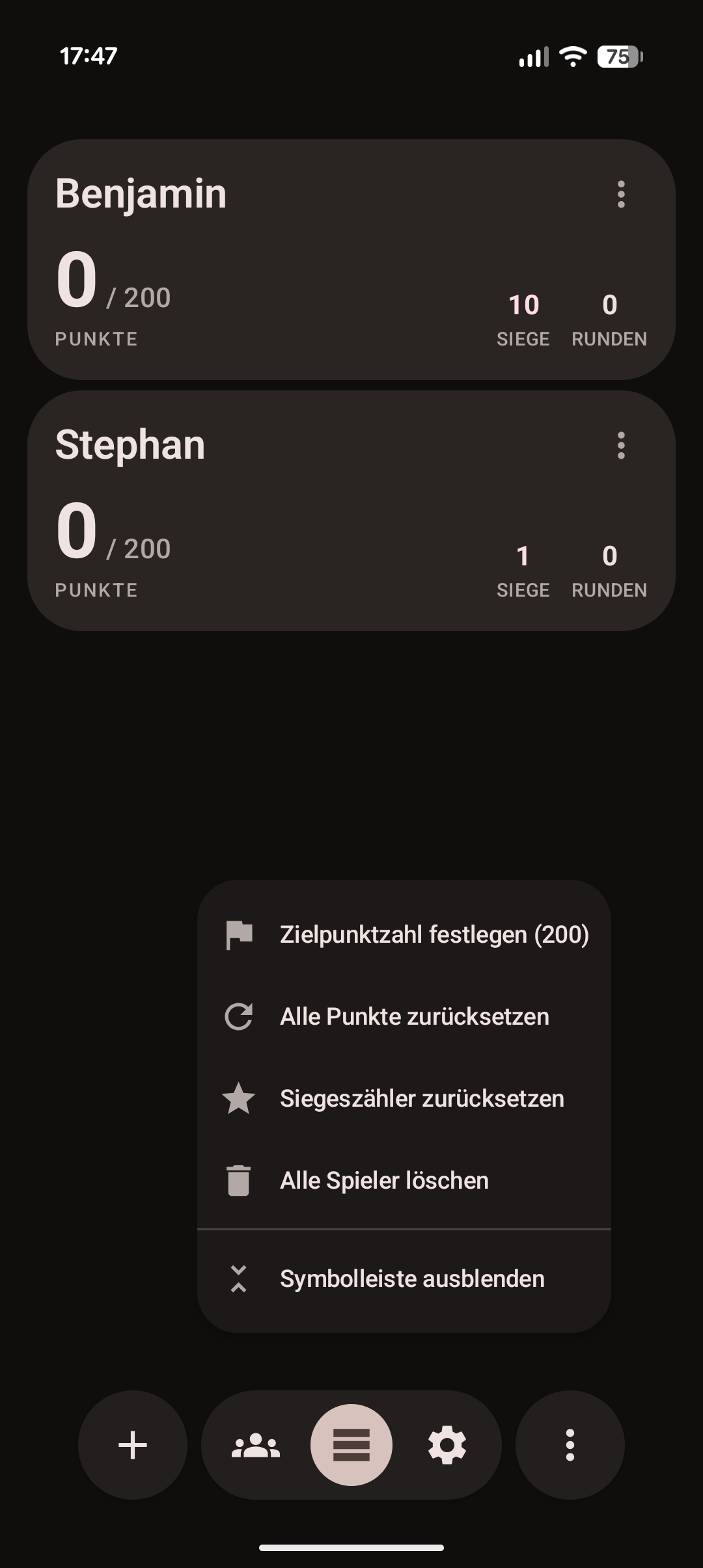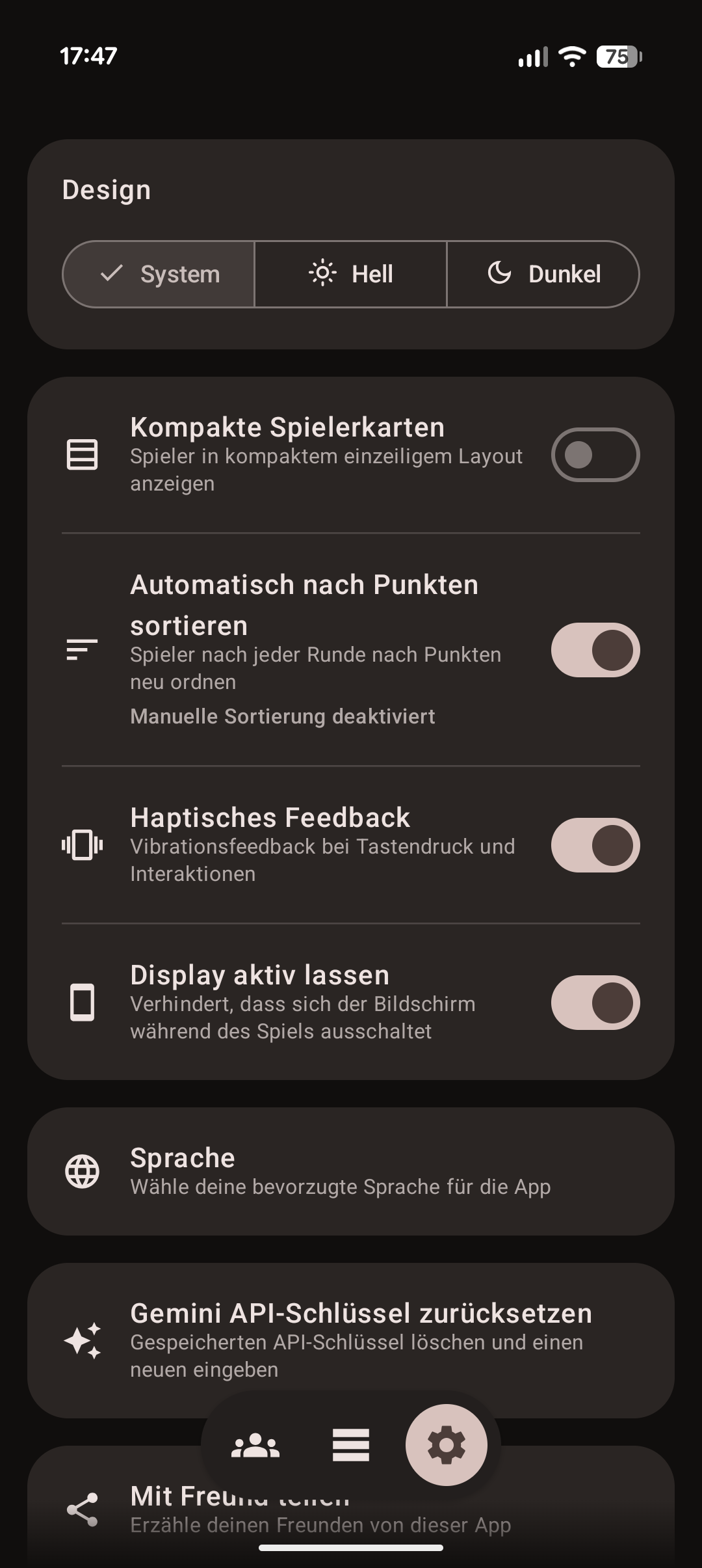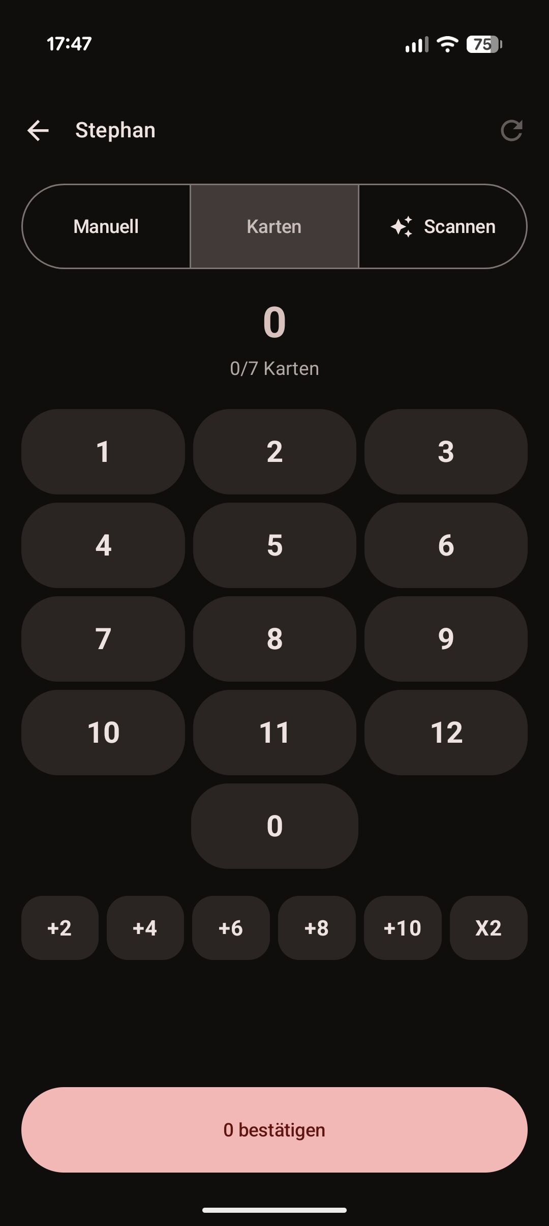 Bei den tollen Animationen bleibt es aber nicht, denn das Eintragen von Punkten wird von passendem haptischen Feedback dezent begleitet. Alle für das Spiel wichtigen Funktionen werden unterstützt. Ihr könnt Spieler hinzufügen und in Gruppen sortieren, die Punkte der Runde entweder anhand aller vom Spieler gehaltenen Karten, deren Gesamtwert oder mit einem Foto, das von Google Gemini verarbeitet wird, zählen. Mehr Features gibt es nicht, braucht es aber auch nicht.