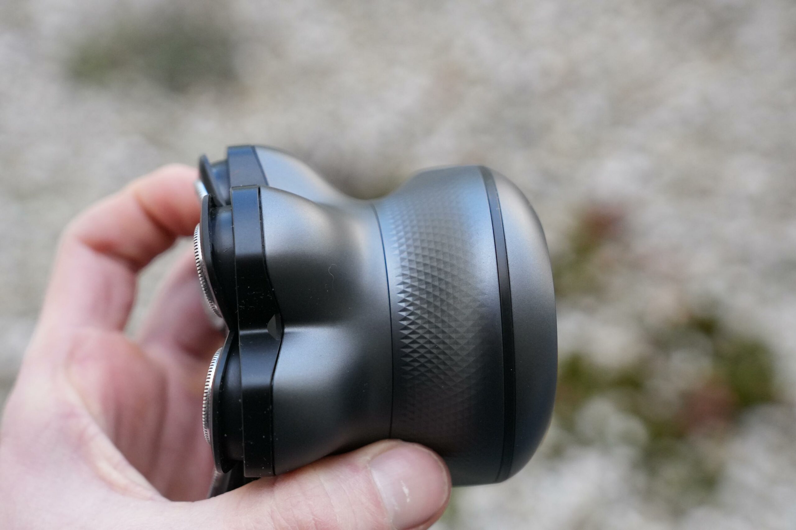 Das Gerät besitzt eine ergonomische Form. Ein funktionaler Unterschied zum Maxgroom-Modell zeigt sich an der Unterseite des Griffs: Hier befindet sich eine Rautenstruktur, die für eine höhere Rutschfestigkeit sorgt. Dies erweist sich insbesondere bei der Nutzung mit nassen Händen als vorteilhaft, sollte aber nicht überbewertet werden.
