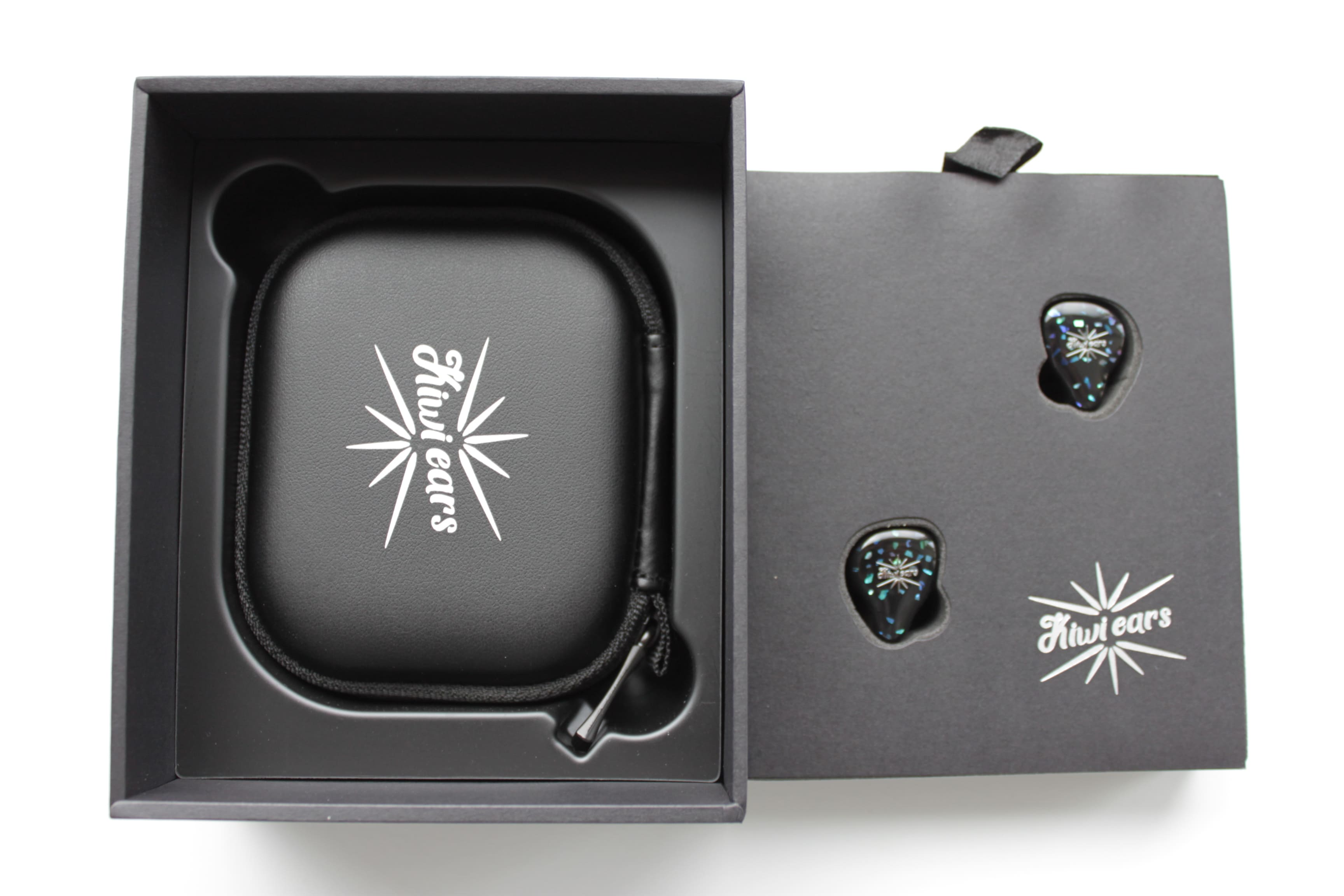 Die Kiwi Ears Astral machen schon beim Auspacken einen sehr hochwertigen Eindruck. Nach dem Öffnen der kleinen Schatzkiste liegen die beiden In-Ears (IEM) wie zwei Edelsteine in den Ausparungen des schwarzen Deckels. Zieht ihr, wie bei einer Schmuckkiste, an der schwarzen Stofflasche am Rand, findet ihr im Bauch der Verpackung eine kleine Transporttasche mit weißem Kiwi-Logo. Innerhalb der schönen Kunstledertasche befindet sich das weitere Zubehör.