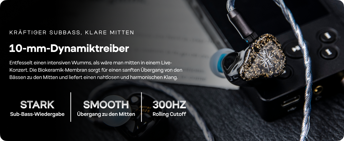 Der 10-mm-Dynamiktreiber aus Biokeramik sorgt dabei für einen derart tiefen, sauberen und präzisen Bass, dass es fast unheimlich ist. Der sanfte Übergang bis in die 300Hz-Mitten ist perfekt abgestimmt, und gerade hier punkten die Kiwi Ears Astral am meisten.