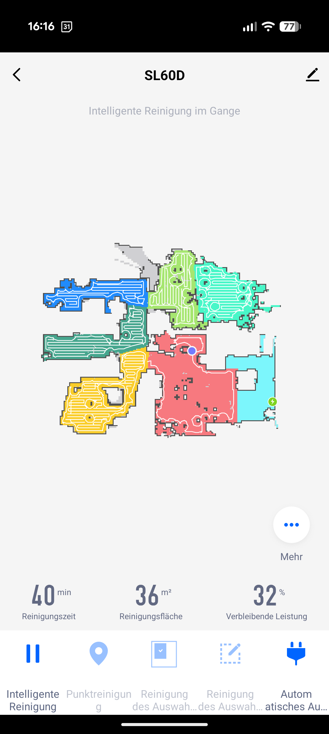 Die Oberfläche der App erinnert an Marken wie Aqara oder SwitchBot. Auch beim Funktionsumfang überzeugt Lubluelu: Für den SL60D stehen umfangreiche Einstellungsmöglichkeiten bereit. Dazu gehören eine Fernsteuerung, drei Stufen an Saugleistung, ein Boost-Modus für Teppiche, geplante Reinigungen, „No-Go-Areas“, ein Reinigungsverlauf und vieles mehr. Sprachansagen sind in verschiedenen Sprachen verfügbar, klingen aufgrund des schwachen Lautsprechers jedoch unschön, weshalb ich sie sofort abgeschaltet habe.