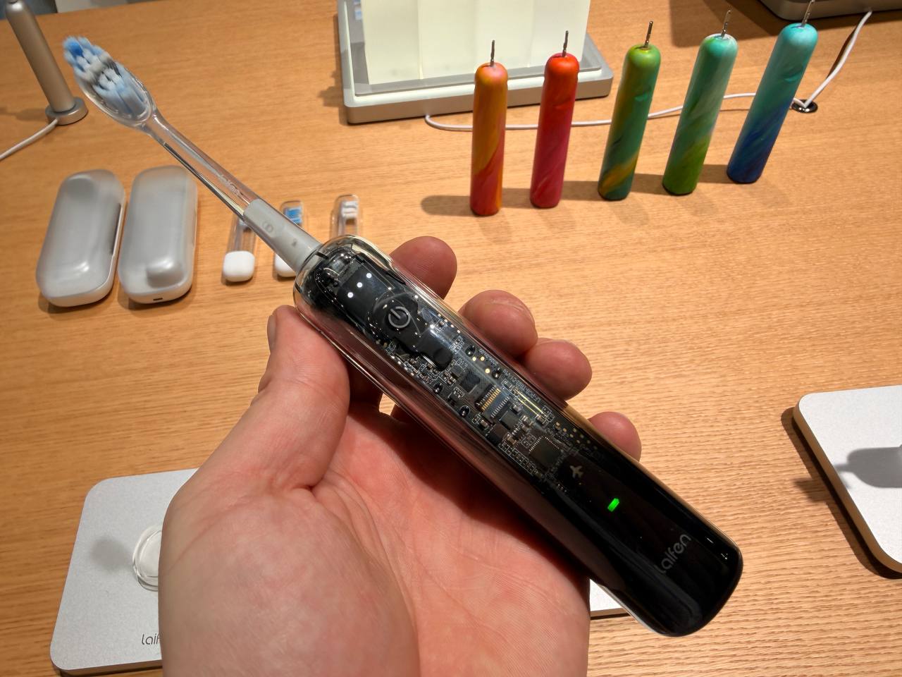 Das auffälligste Merkmal neben der Technik ist das neue Design: Neben den bekannten Varianten aus ABS, Aluminium und Edelstahl gibt es nun eine Version in „Transparent Black“. Das sieht technisch und modern aus, wodurch das Innenleben der Bürste sichtbar wird.