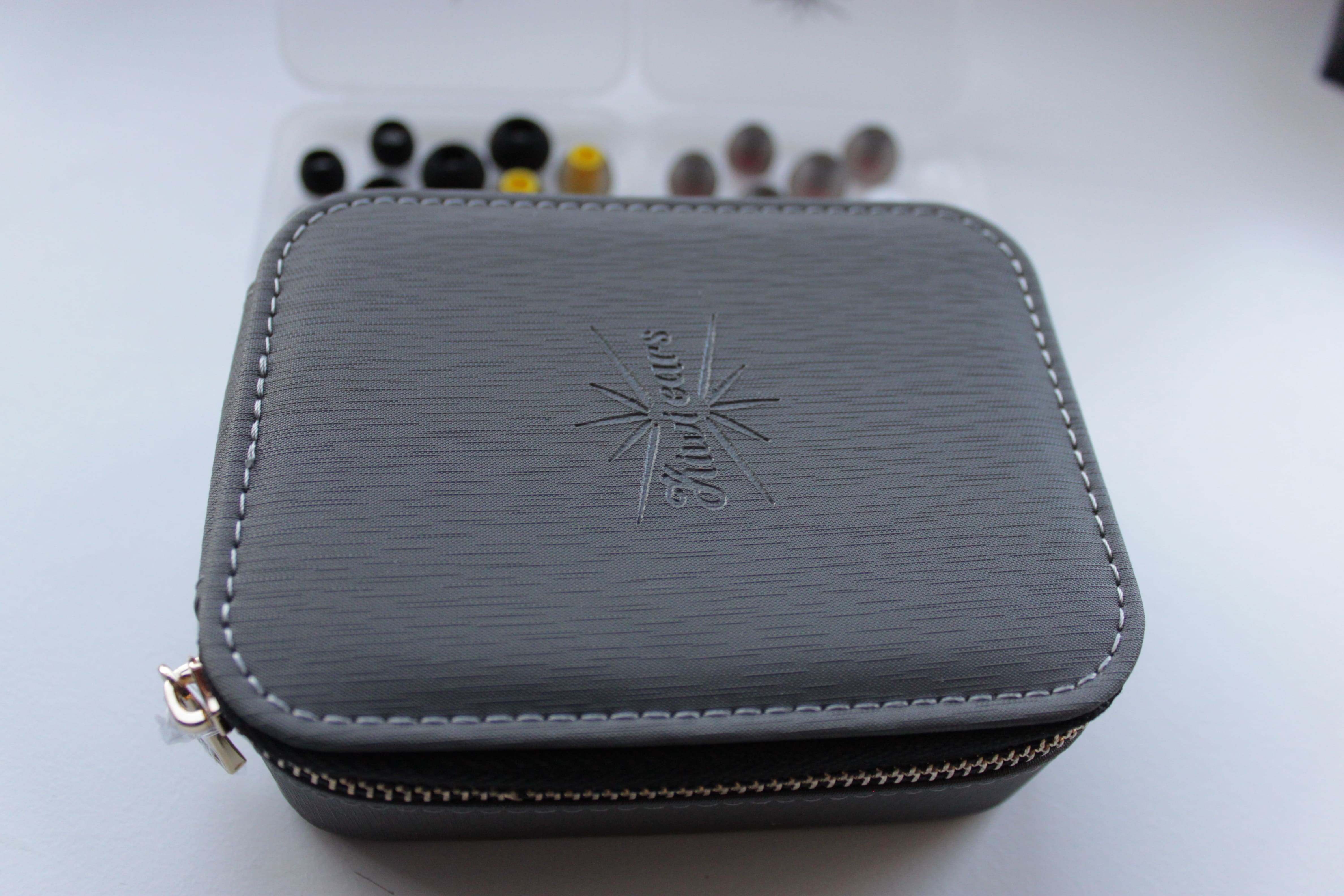 Das Öffnen der Verpackung gleicht dem Öffnen einer kleinen Schatzkiste. Oben auf dem schwarzen Deckel lächeln uns die beiden wunderschönen In-Ear-Monitore (IEM) an. Daneben liegt in einer weiteren schwarzen Schatulle eine schöne Transporttasche.
