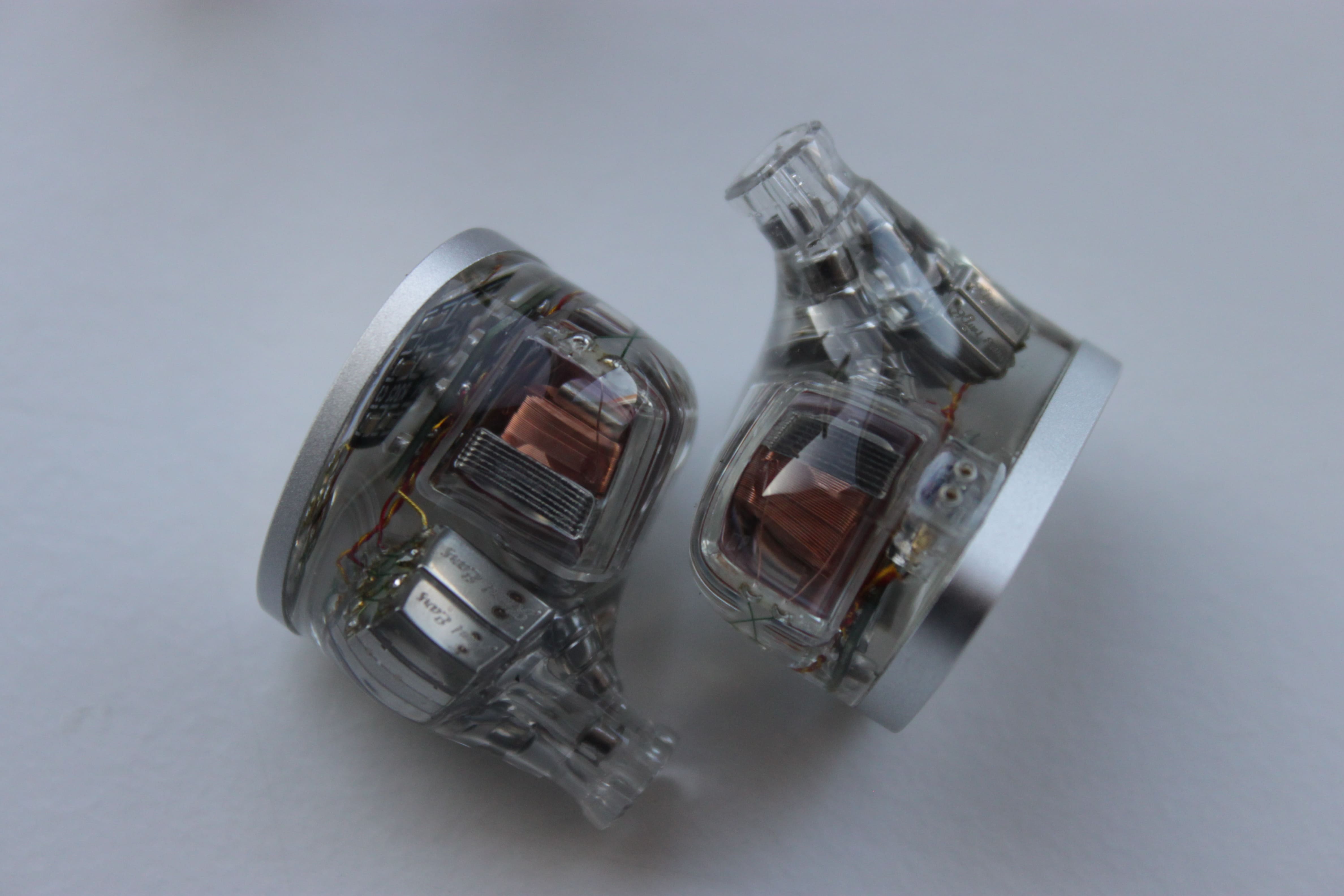 Hier seht ihr jeden einzelnen der 10 BA-Treiber, die feinen Drähte, die zu den Spulen führen, und vieles mehr. Ihr könnt eindrucksvoll erkennen, welche Treiber in welchen Kanal führen, und die astreine Verarbeitung innerhalb der IEMs bestaunen. Das Acrylgehäuse ist zudem komplett mit Harz gefüllt.