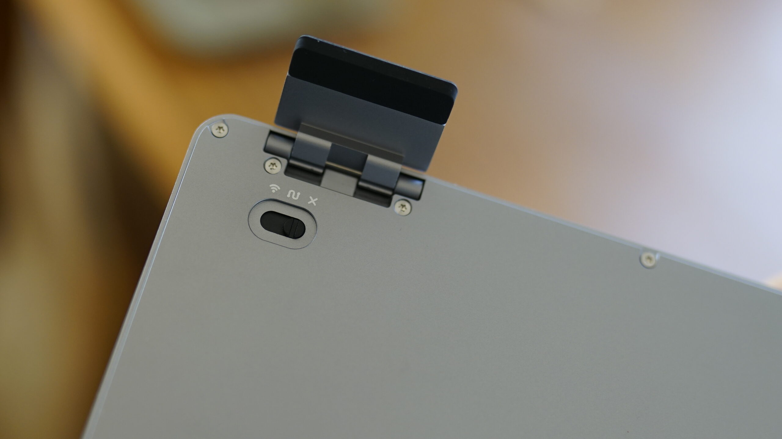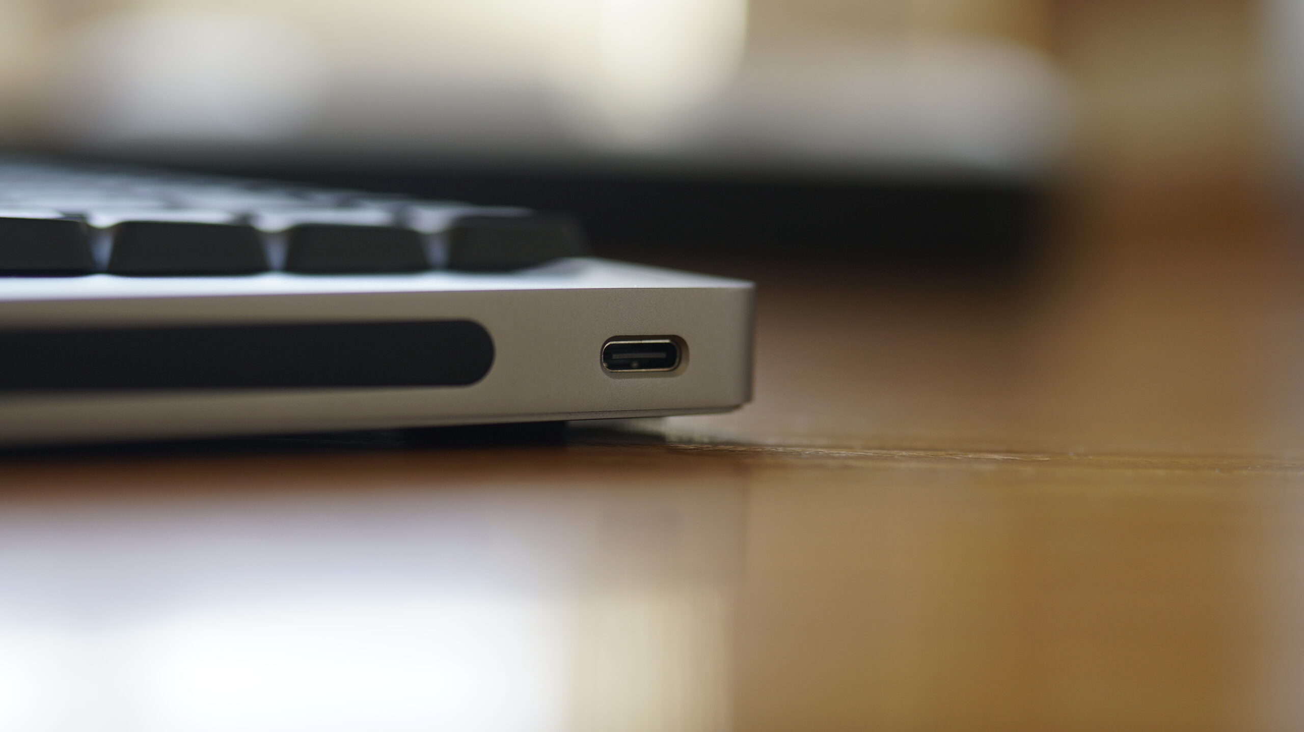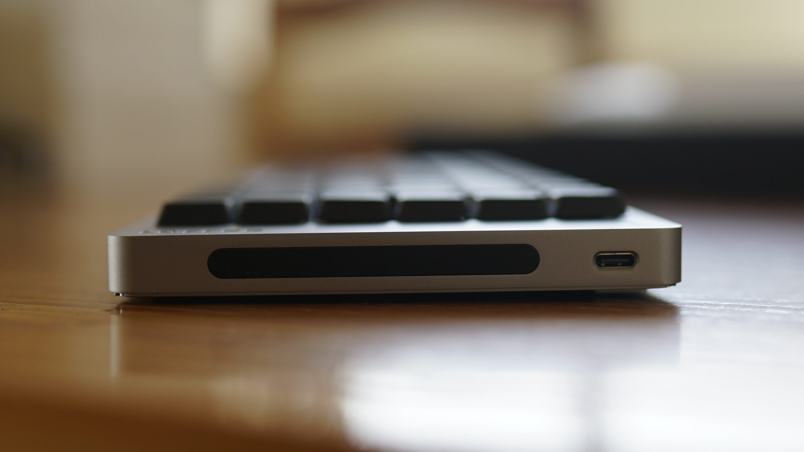 Die Variante mit 100 Tasten, auf der ich diesen Bericht schreibe, misst 398,2 x 126 x 21,5 Millimeter und wiegt 870 Gramm. Im rechten Rahmen des Aluminiumgehäuses sind der USB-Anschluss zum Aufladen und eine Touchbar verbaut. Auf der Unterseite befinden sich zwei Standfüße, sodass ihr euch zwischen einem Tippwinkel von 0° und 7° entscheiden könnt. Unter einem der Standfüße ist ein Schiebeschalter versteckt, mit dem ihr zwischen den Modi wechselt und die Tastatur ausschaltet.