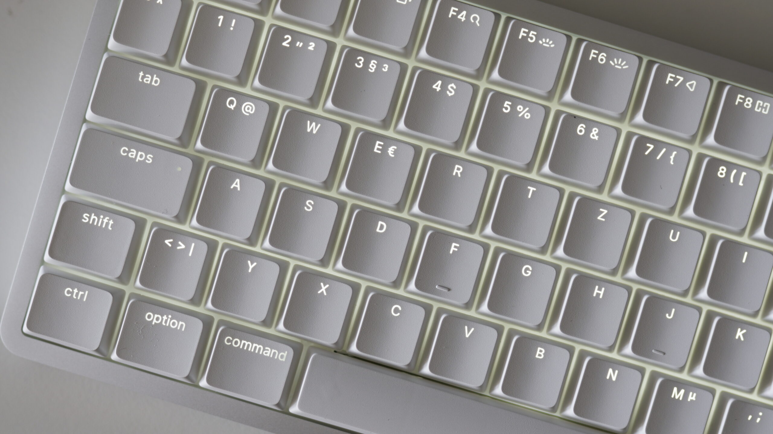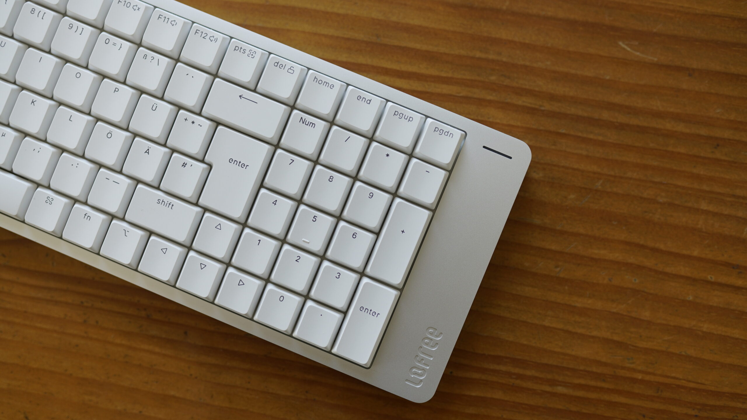 Wir haben die Lofree Flow 2 im deutschen QWERTZ-Layout im Test. Das Schreibgefühl empfand ich insgesamt als sehr gut, auch wenn die schmalen Abstände zwischen den Tasten einige Stunden Eingewöhnung erforderten. Spätestens nach einigen Tagen konnte ich auf der Lofree Flow 2 schneller und fehlerfrei schreiben. Ich bevorzuge die kurzen Wege im Vergleich zur Logitech G513, die ich jahrelang verwendete.