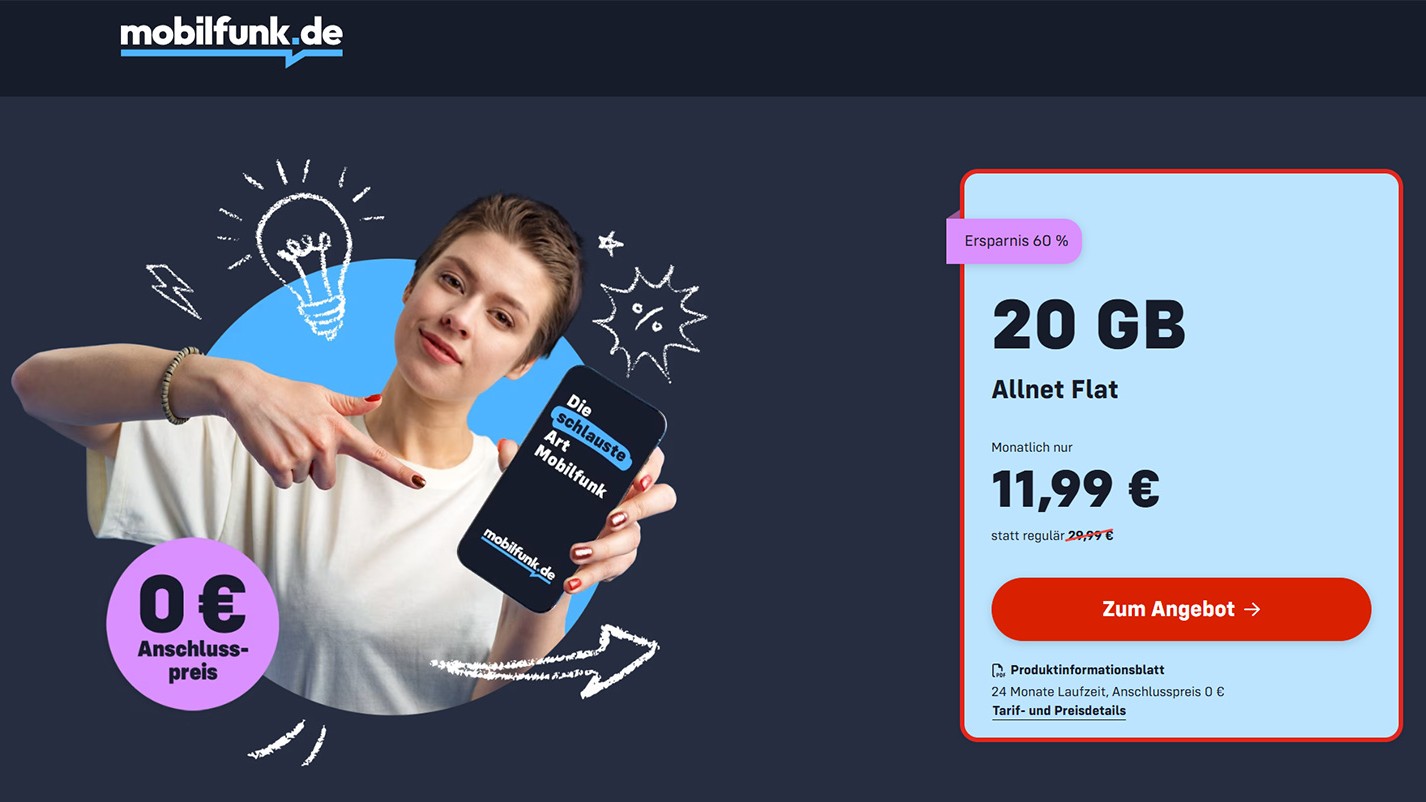 Da konnte Freenet sich aber eine starke Domain sichern 😅. Die Tarife von mobilfunk.de sind simpel strukturiert und man zahlt nicht für unnötig viel Datenvolumen. Wer keine Lust auf Tarifvergleiche hat und einfach ein solides Paket in seinem Wunschnetz sucht, macht hier nichts grob falsch.