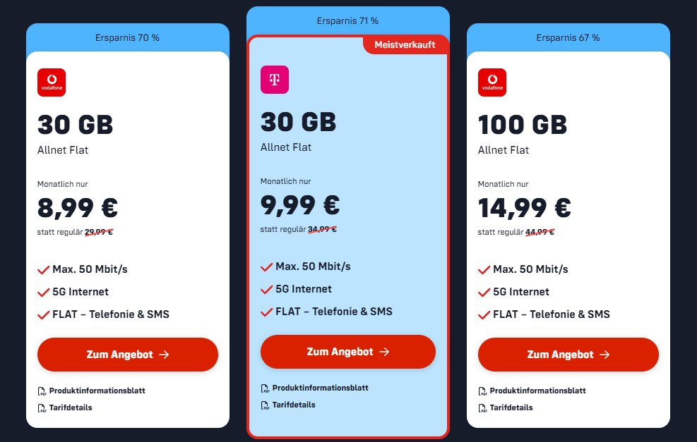 Mit 8,99€ für 30GB oder sogar 14,99€ für satte 100GB im Vodafone-Netz liefert der Anbieter Vielsurfern ein spannendes Paket. Doch auch hier mischt mit SIMon mobile (zum Deal) ein mächtiger Gegenspieler mit. Die Marke mit dem Waschbären überzeugt durch deutlich mehr Flexibilität und lockt regelmäßig mit starken Sonderaktionen.