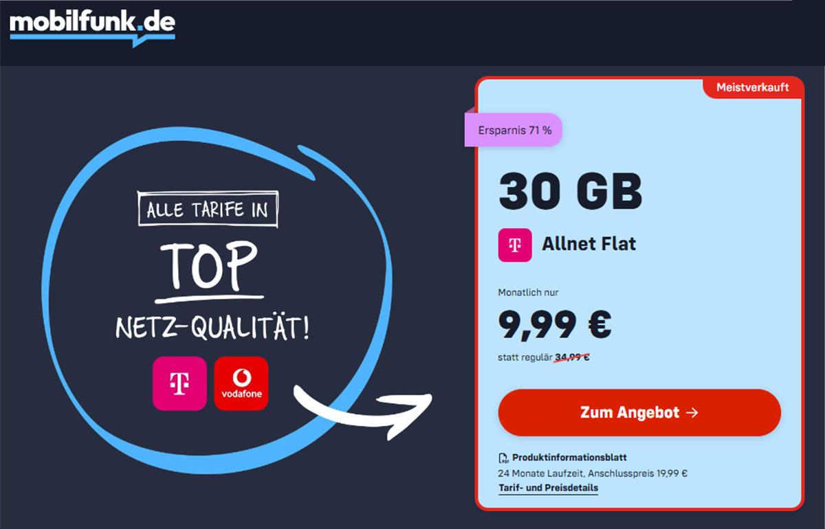 Mobilfunk.de: 30GB Telekom-Tarif für 9,99€