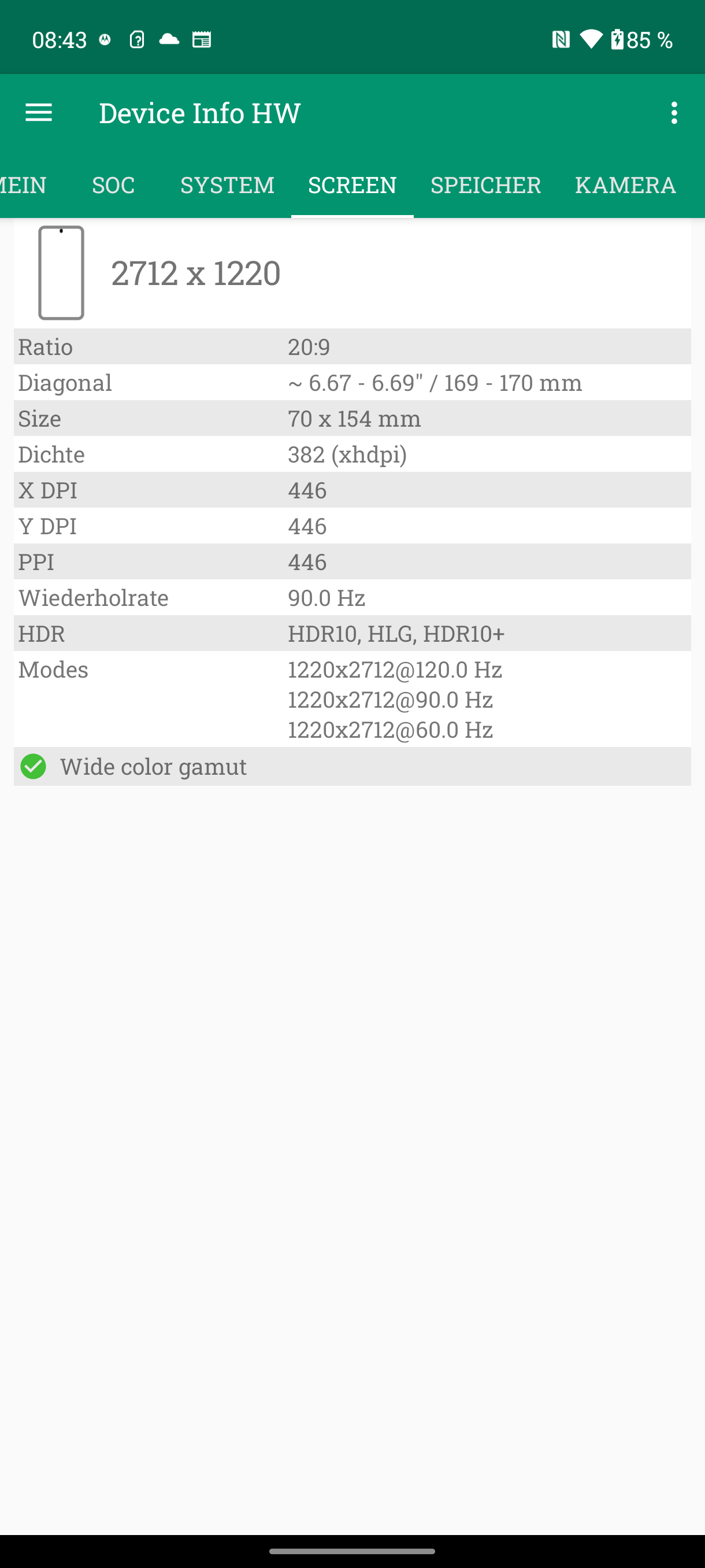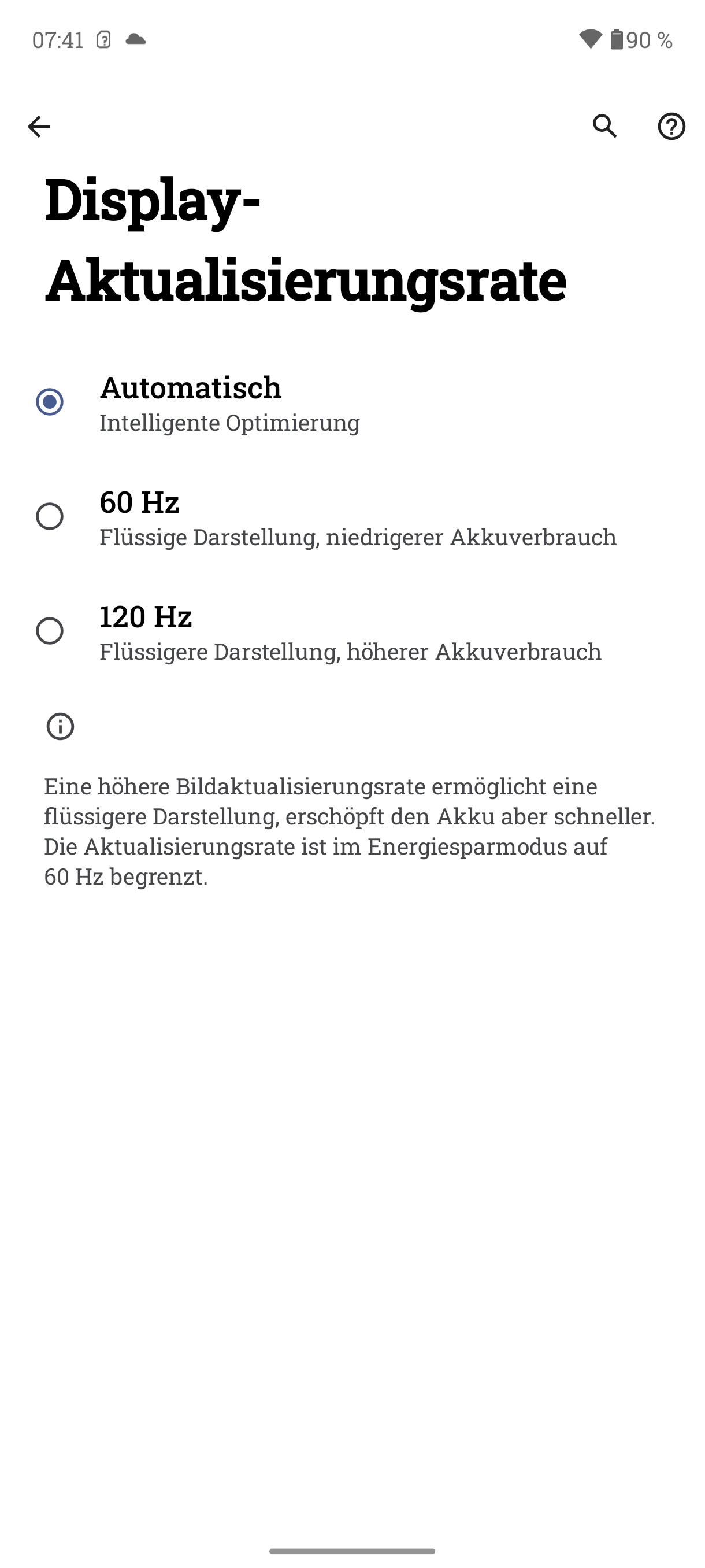 Motorola verbaut ein 6,67 Zoll großes Curved-pOLED-Display. Die Auflösung beträgt 2712 x 1220 Pixel, was zu einer Pixeldichte von 446 Pixel pro Zoll führt. Die Abtastrate beträgt 300 Hertz. Die Bildwiederholrate liegt bei bis zu 120Hz. Die Regelung der Bildwiederholrate des Motorola Edge 60 ist ungewöhnlich: Üblicherweise haben wir die Auswahl zwischen „Automatisch“, 60Hz und 120Hz, wobei die Frequenz im Automatikmodus beispielsweise von 120Hz auf 60Hz wechselt.