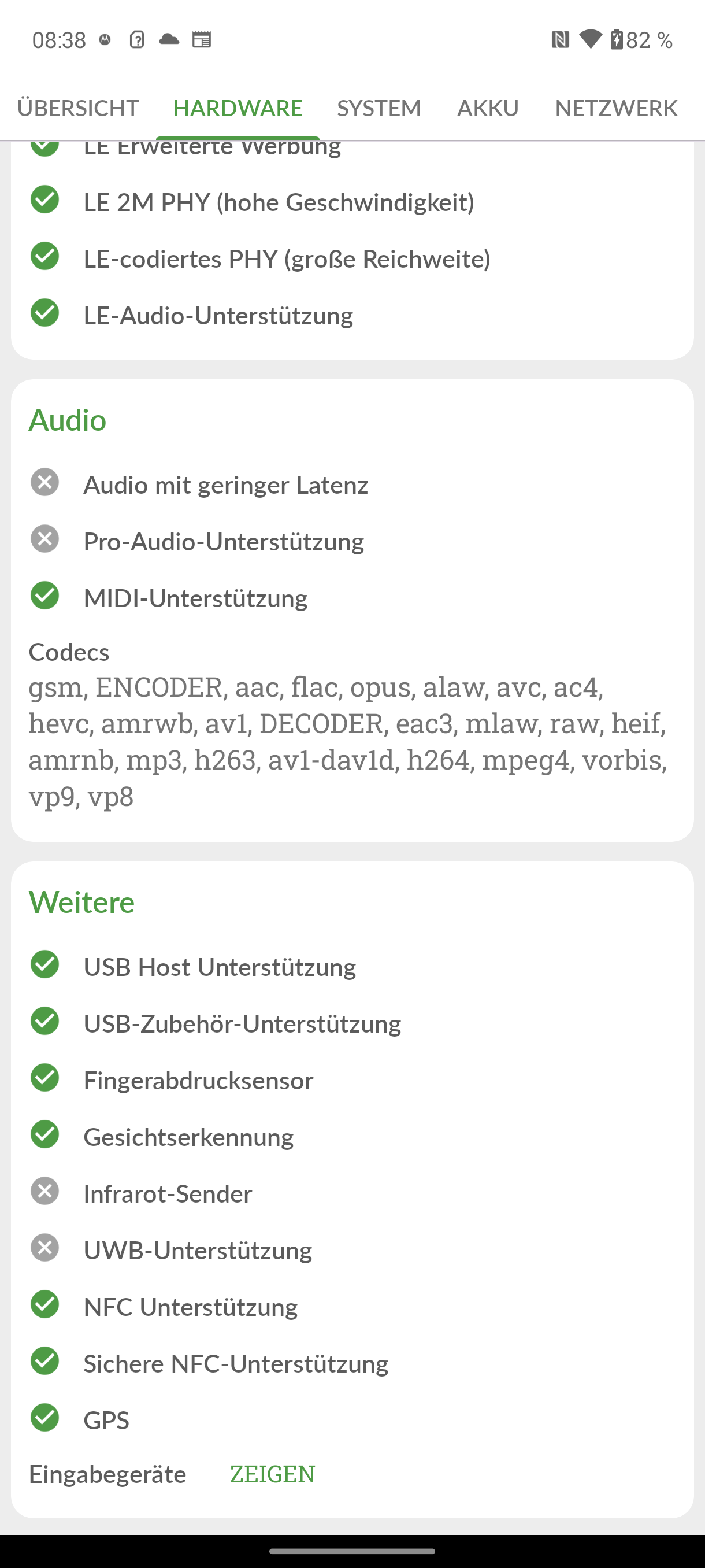 Die üblichen Sensoren wie Beschleunigungs-, Näherungs-, Helligkeitssensor, Gyroskop und Kompass sind ebenfalls vorhanden. Der Fingerabdrucksensor befindet sich im Display und sowohl dieser als auch die Gesichtserkennung entsperren das Smartphone nicht nur schnell, sondern auch sehr zuverlässig, selbst im Dunkeln. Es gibt zwei Lautsprecher: einen auf der Unterseite und einen, der in die Hörmuschel integriert wurde. Ihnen fehlt es etwas an Tiefe, sie bieten dennoch eine gute Qualität und werden laut. Der Vibrationsmotor wirkt leider etwas schwammig und wenig präzise.