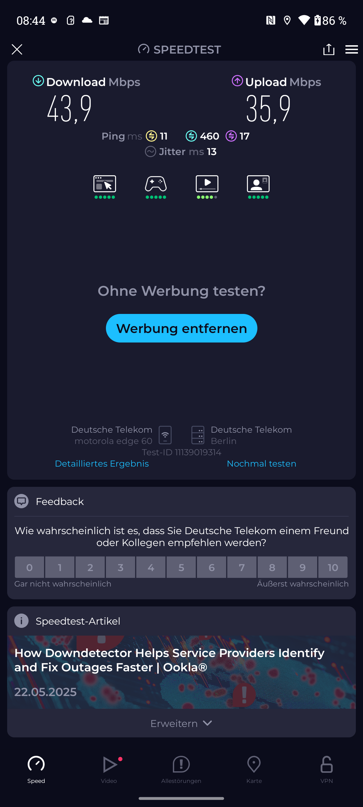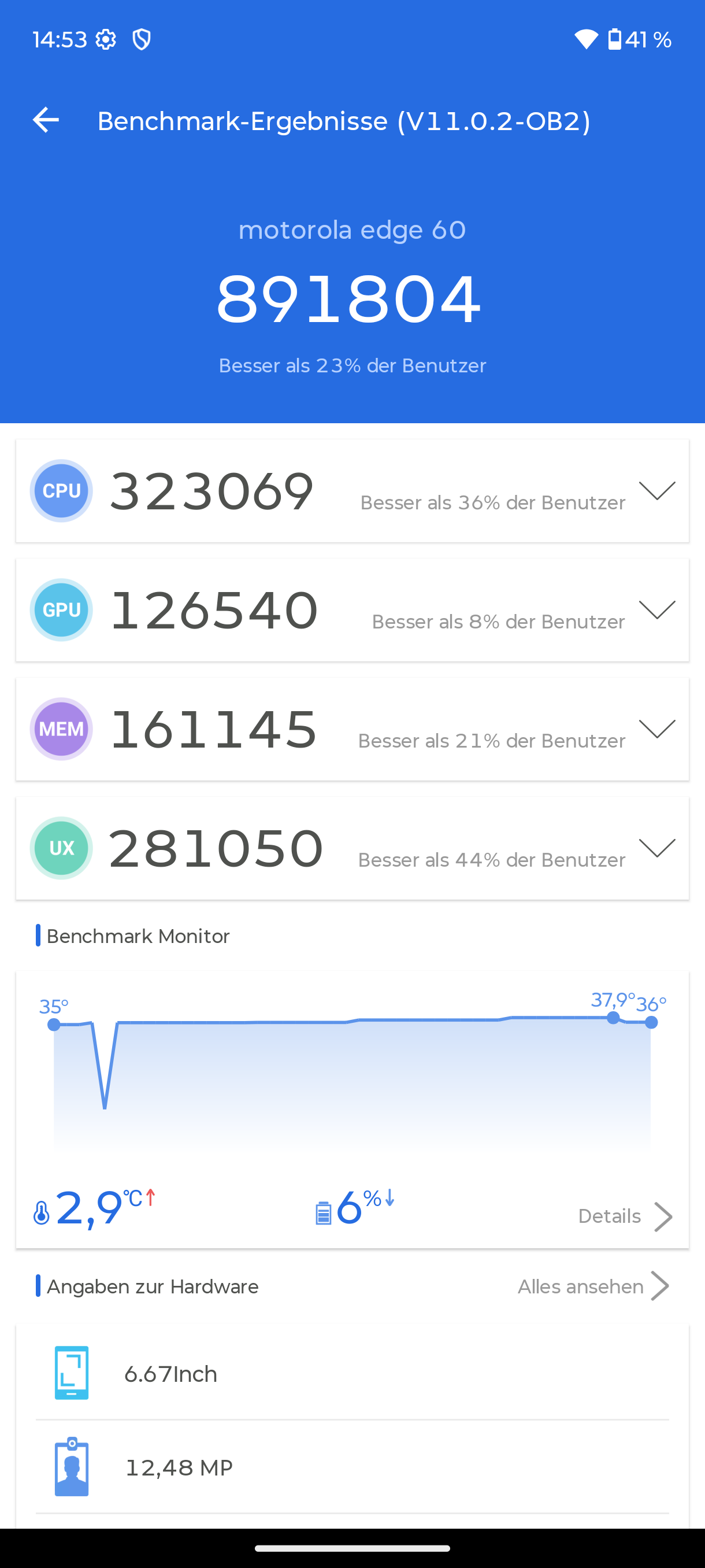 Leider wurde die Optimierung beim Motorola Edge 60 vernachlässigt. Die Leistung wäre vorhanden, das Gerät zeigt jedoch selbst bei einfachen Aufgaben immer wieder Hänger und Ruckler. Insbesondere bei der Nutzung der Kamera ist das eine echte Geduldsprobe. Aber auch bei kleinen Aktionen wie dem Aufrufen des Einstellungsmenüs, dem Wechseln von Apps oder dem Ändern des Designs treten immer wieder kleine Gedenksekunden und Ruckler auf. Während unseres Testzeitraums stand kein Update zur Verfügung und wir hoffen, dass Motorola dieses Problem behebt. So verschenkt das Gerät nur leichtfertig Punkte.