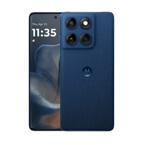 Beim Motorola Edge 60 habt ihr die Wahl zwischen zwei Farben mit unterschiedlichen Materialien. Zum einen „Gibraltar Sea”, ein tiefes Marineblau mit angerauter Silikonrückseite, und zum anderen „Shamrock”, ein leuchtendes Grün mit Lederimitat. Als Testgerät stand uns das blaue Modell zur Verfügung. Beim Rahmen kommt Kunststoff zum Einsatz, der keineswegs billig wirkt. Andere Hersteller setzen seit Jahren auf ein kantiges Design. Die einen mögen es, die anderen weniger. Daher ist es erfrischend, wieder einmal ein abgerundetes Design in den Händen zu halten.
