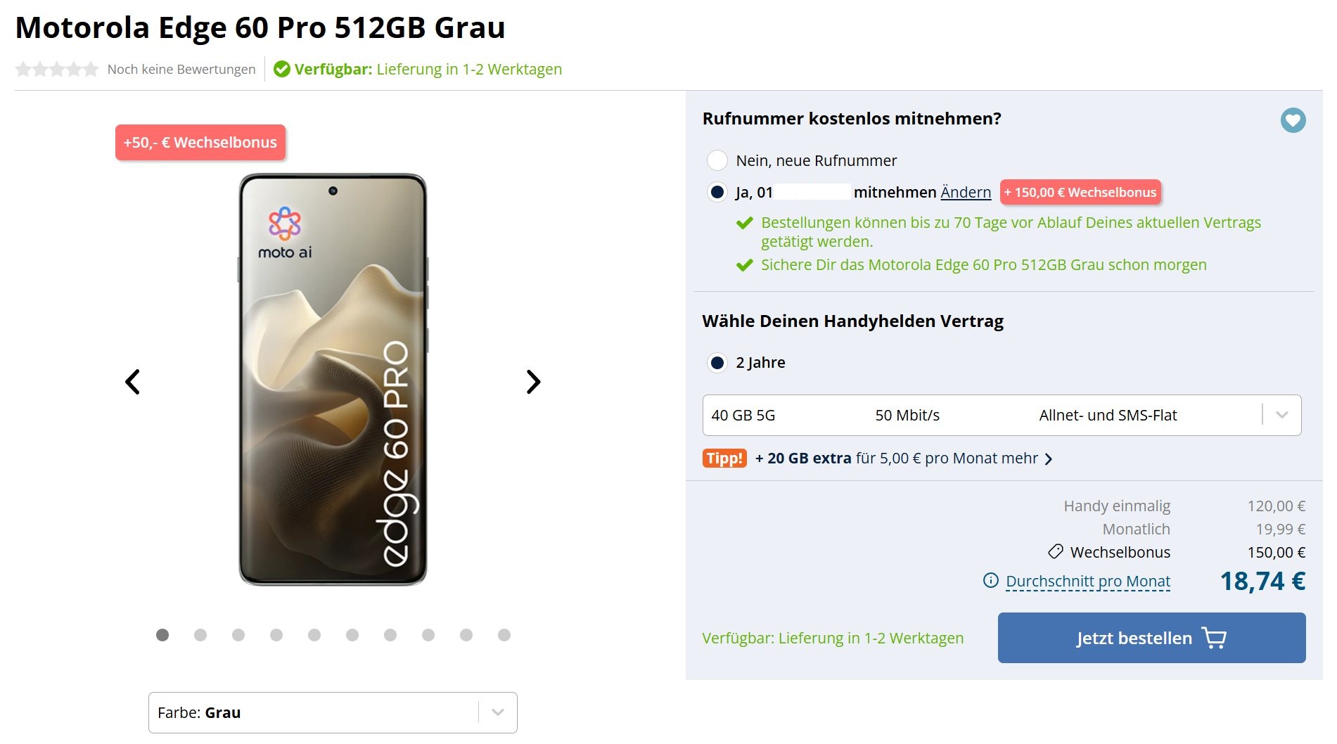 Kaum haben wir das Motorola Edge 60 Pro getestet, gibt es bereits ein passendes Vertragsangebot. Handyhelden kombiniert das Smartphone mit einem Freenet-Tarif im 5G-Netz der Telekom, mit dem ihr monatlich 40GB Datenvolumen und eine Allnet-Flat erhaltet. Die Gesamtkosten für das Paket liegen bei rund 450€.