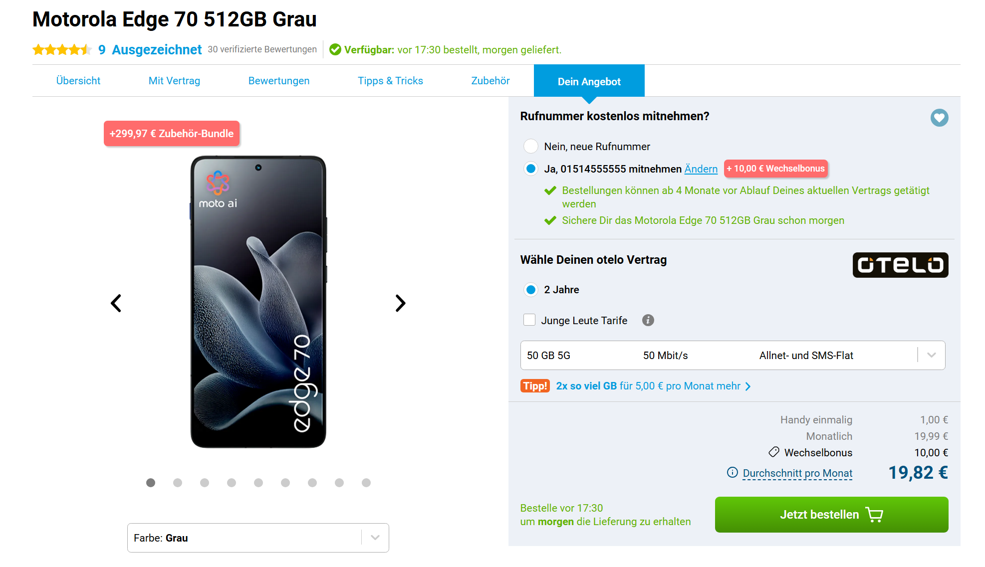 Der aktuelle Vergleichspreis für das Motorola Edge 70 (512GB) liegt bei 559€. Zieht man die Gesamtkosten vom Gerätepreis ab, ergibt sich ein hervorragender Effektivpreis: