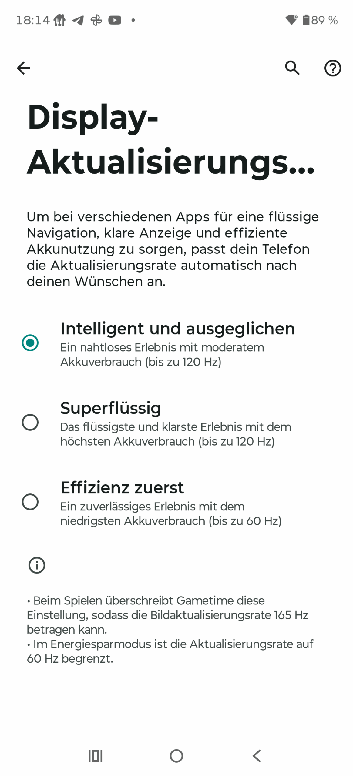 Eine Besonderheit ist die hohe Bildwiederholrate von 165Hz. Dank der LTPO-Technik soll sich das Panel dynamisch zwischen 1Hz und 165Hz an den dargestellten Inhalt anpassen, um Energie zu sparen. In der Praxis sieht die Realität allerdings etwas anders aus: Bei Bewegungen läuft der Bildschirm im System durchgehend mit sehr flüssigen 120Hz und fällt bei Stillstand zuverlässig auf 1Hz herunter. Die beworbenen 165Hz haben wir im Test nicht zu Gesicht bekommen. Das ist zwar kein Beinbruch, da wohl kaum jemand den Unterschied zwischen 120Hz und 165Hz wahrnehmen kann, sollte aber durchaus erwähnt werden. Die Touch-Abtastrate liegt bei durchschnittlichen 360Hz.