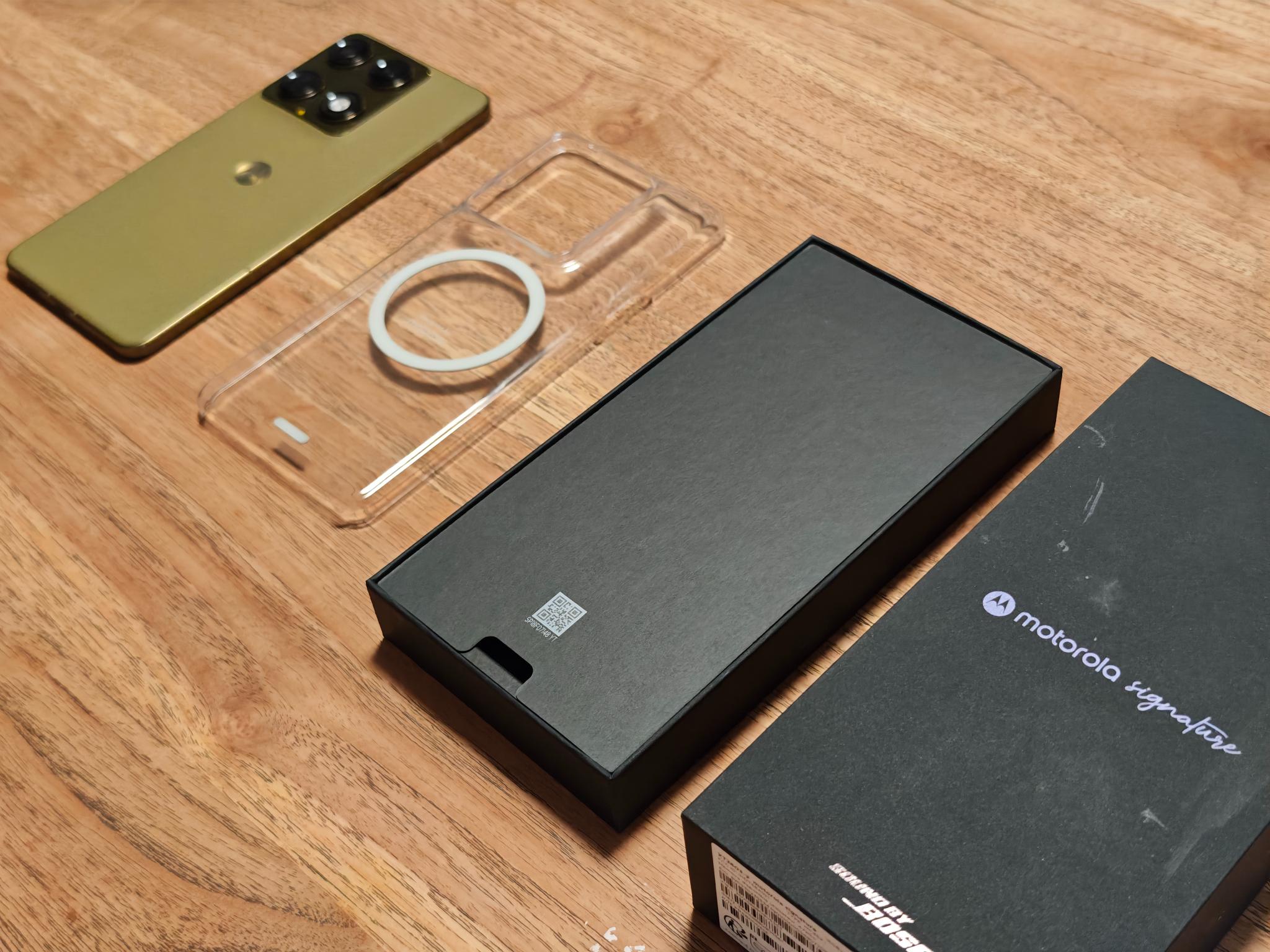 In der Box findet ihr immerhin ein USB-C-zu-USB-C-Kabel und auch eine Schutzhülle. Bei dieser handelt es sich um ein hartes, transparentes Kunststoff-Case, das mit einem MagSafe-artigen Magnetring versehen ist. Motorola verzichtet darauf, ab Werk eine Displayschutzfolie anzubringen.