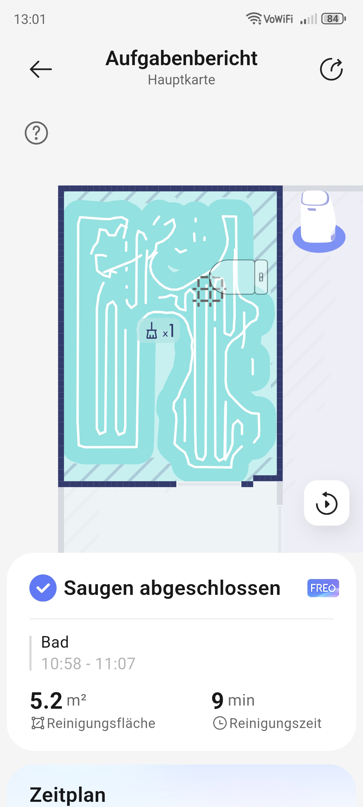 Die Freo-Modi überzeugen durch ihre Leistung. Wenn ihr den Narwal bei der Arbeit beobachtet, stellt ihr fest, dass er bei Bedarf bestimmte Stellen mehrfach reinigt. Er erkannte selbstständig, dass die Küche eine doppelte Reinigung benötigt, während im Wohnzimmer mit Teppichboden die Saugstufe auf „Turbo“ erhöht und die Wischwalze angehoben blieb.