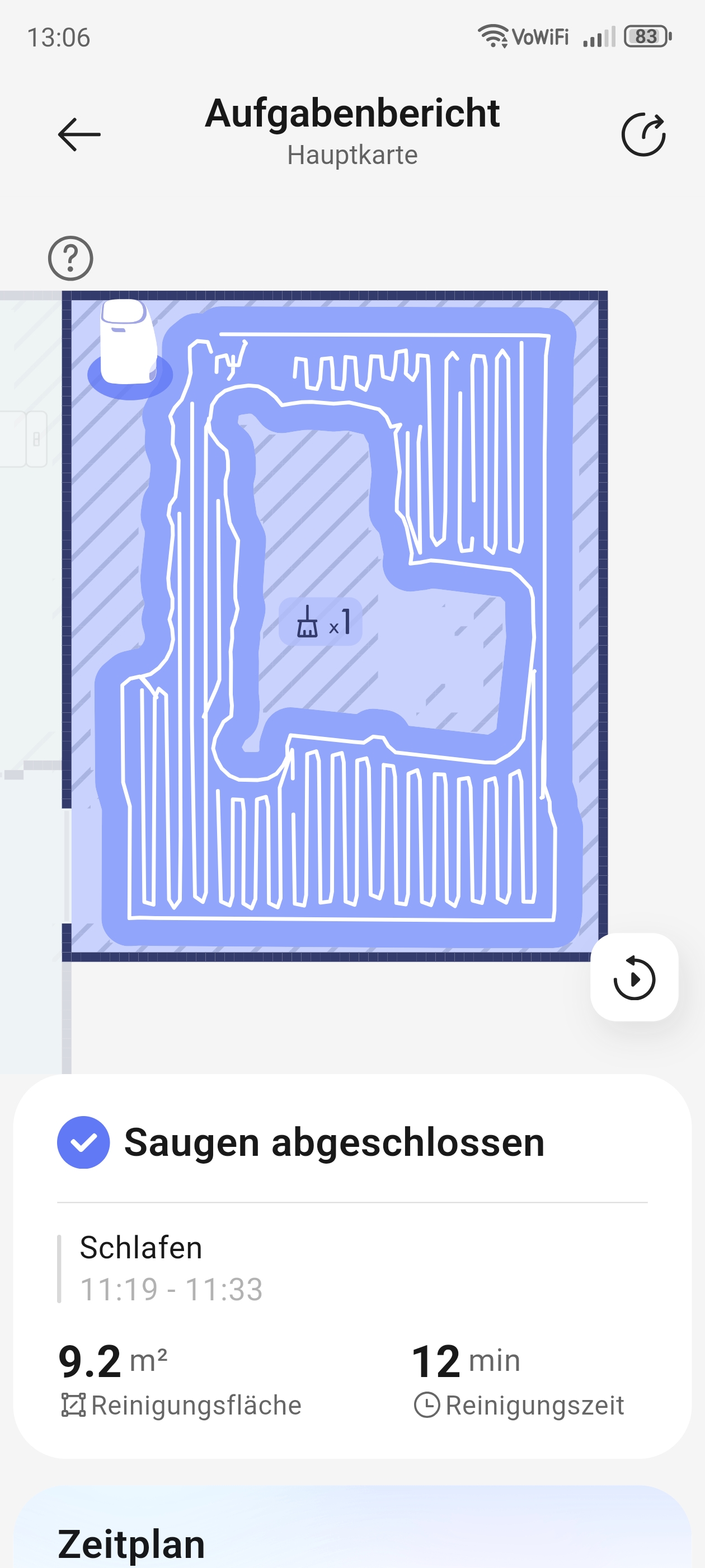 Ein Klick auf den Saugroboter führt direkt zur Steuerung des Roboters. Hier findet ihr die Karte sowie sämtliche Reinigungsmodi und -optionen. Über den linken Reiter „Planen“ könnt ihr Zeitpläne für Reinigungsaufgaben erstellen, während der Reiter „Reise“ den Reinigungsverlauf inklusive detaillierter Statistiken anzeigt.