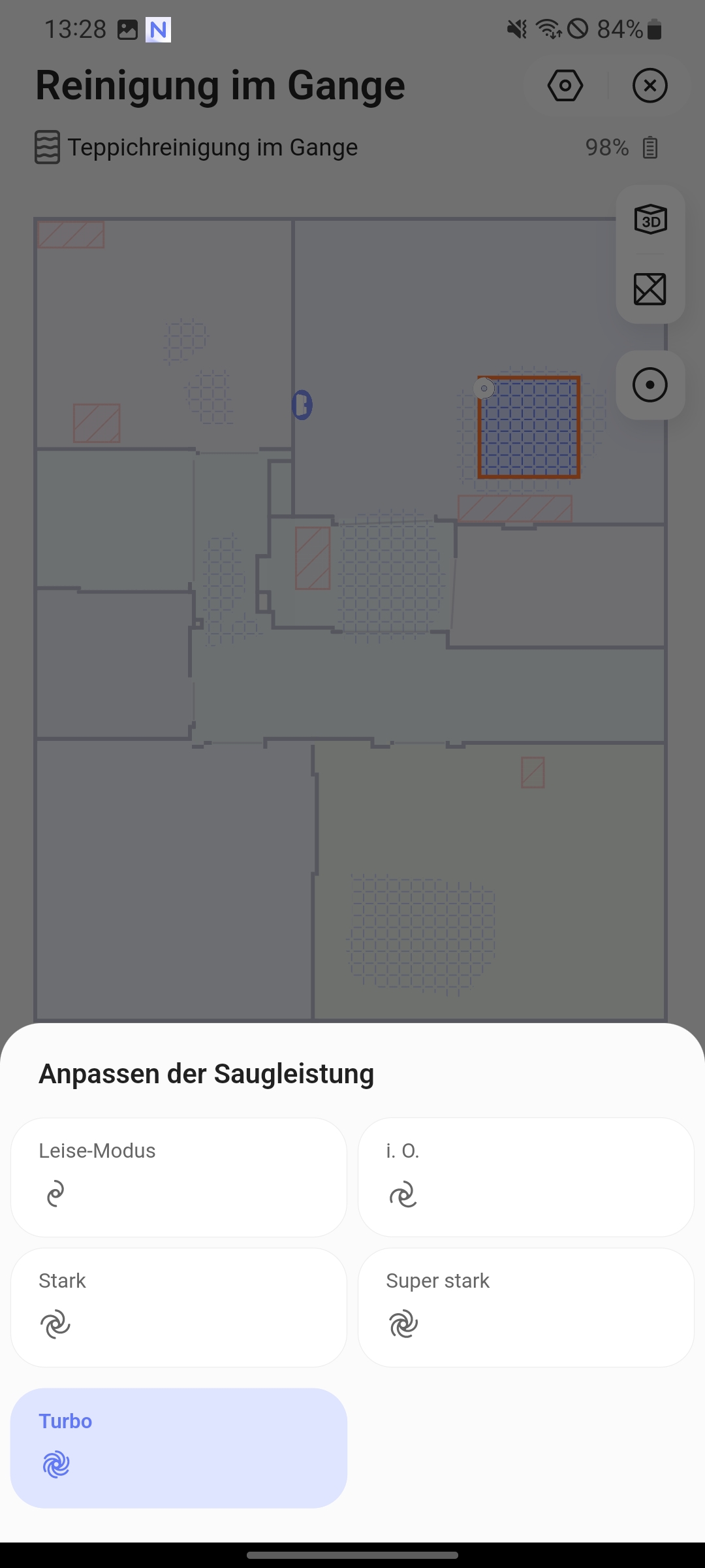 | Sorgfältigkeitsgrad | Standard (Roboter folgt Standardrouten mit Zeiteffizienz; Sorgfältig (Roboter folgt enge Routen mit mehr Effizienz und längerer Dauer) |