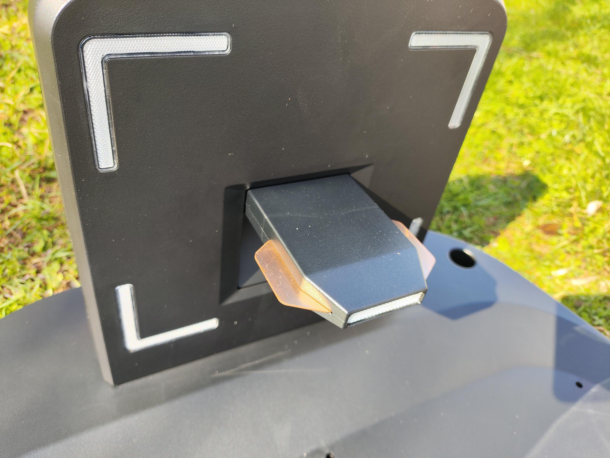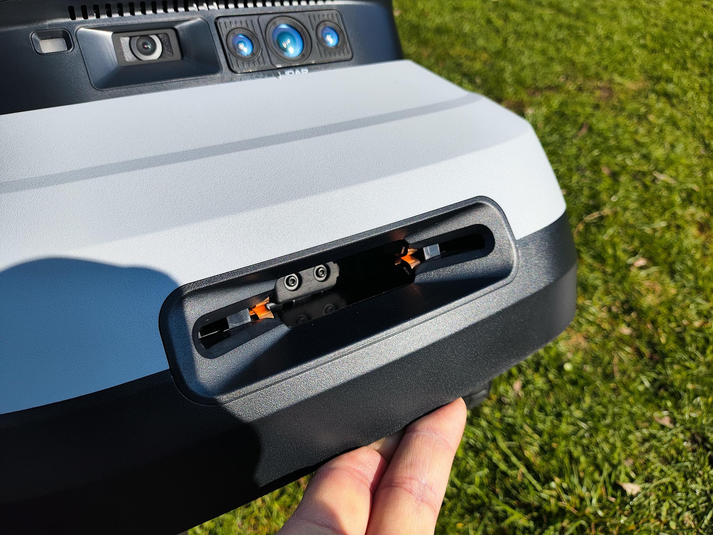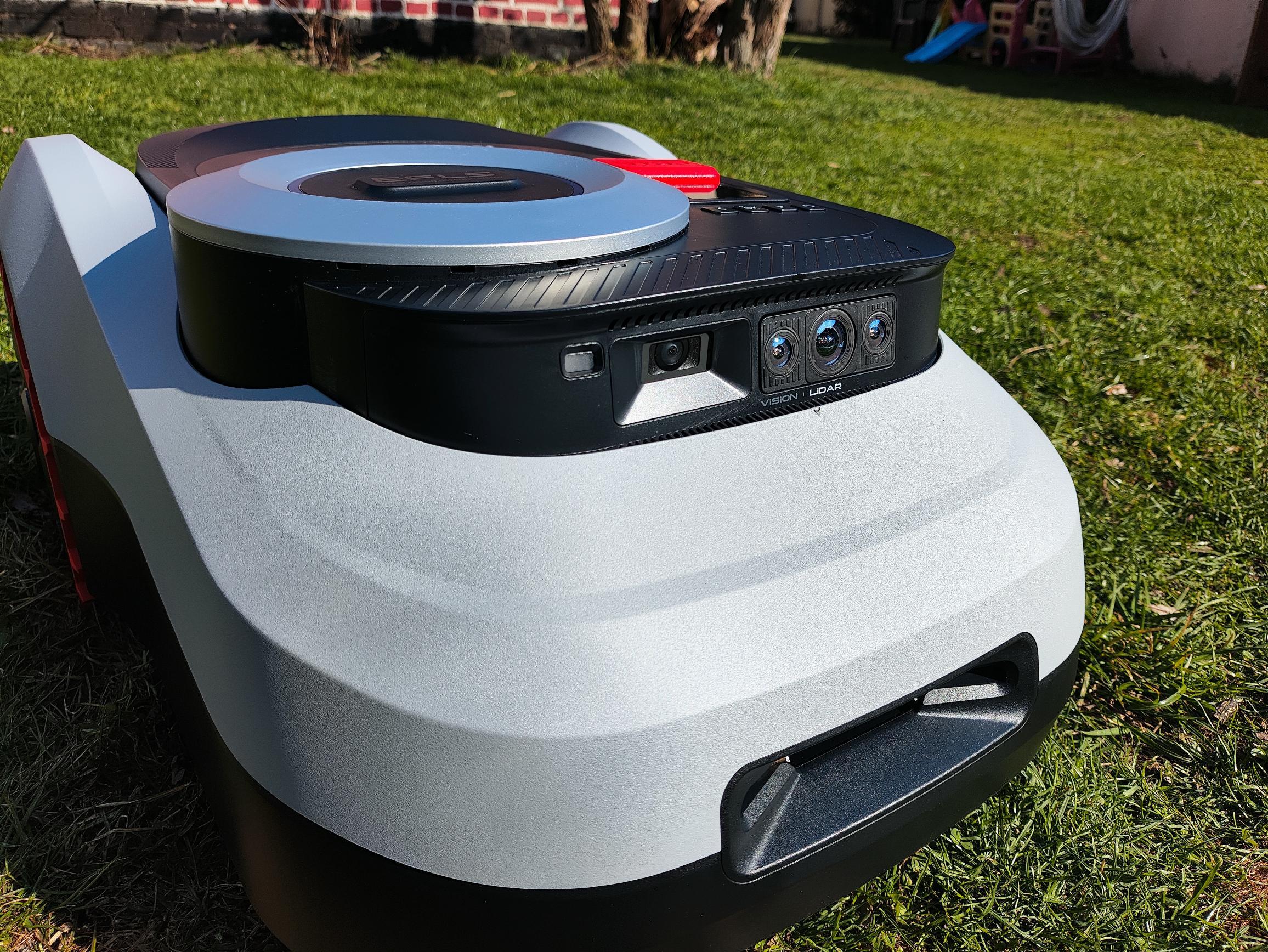 Im Turmaufbau befindet sich das Herzstück der Navigationstechnik. Der LiDAR-Sensor tastet seine Umgebung mit bis zu 200.000 Punkten pro Sekunde ab. Die daneben liegenden Kameras erfassen sowohl Hindernisse als auch unterschiedliche Untergründe, Grundstücksgrenzen oder Lebewesen. Mithilfe der kleinen LED in der linken oberen Ecke kann der Navimow seine Kameras auch bei schlechten Lichtverhältnissen einsetzen. Die Ladekontakte sind vollständig in das Gehäuse eingelassen und somit sehr gut vor Feuchtigkeit oder Verschmutzungen geschützt. Auch wenn bei so viel schlichter Eleganz und Kunststoff kein Premiumgefühl aufkommt, so ist die Verarbeitung des Navimow dennoch erstklassig und gibt keinen Anlass für Kritik.