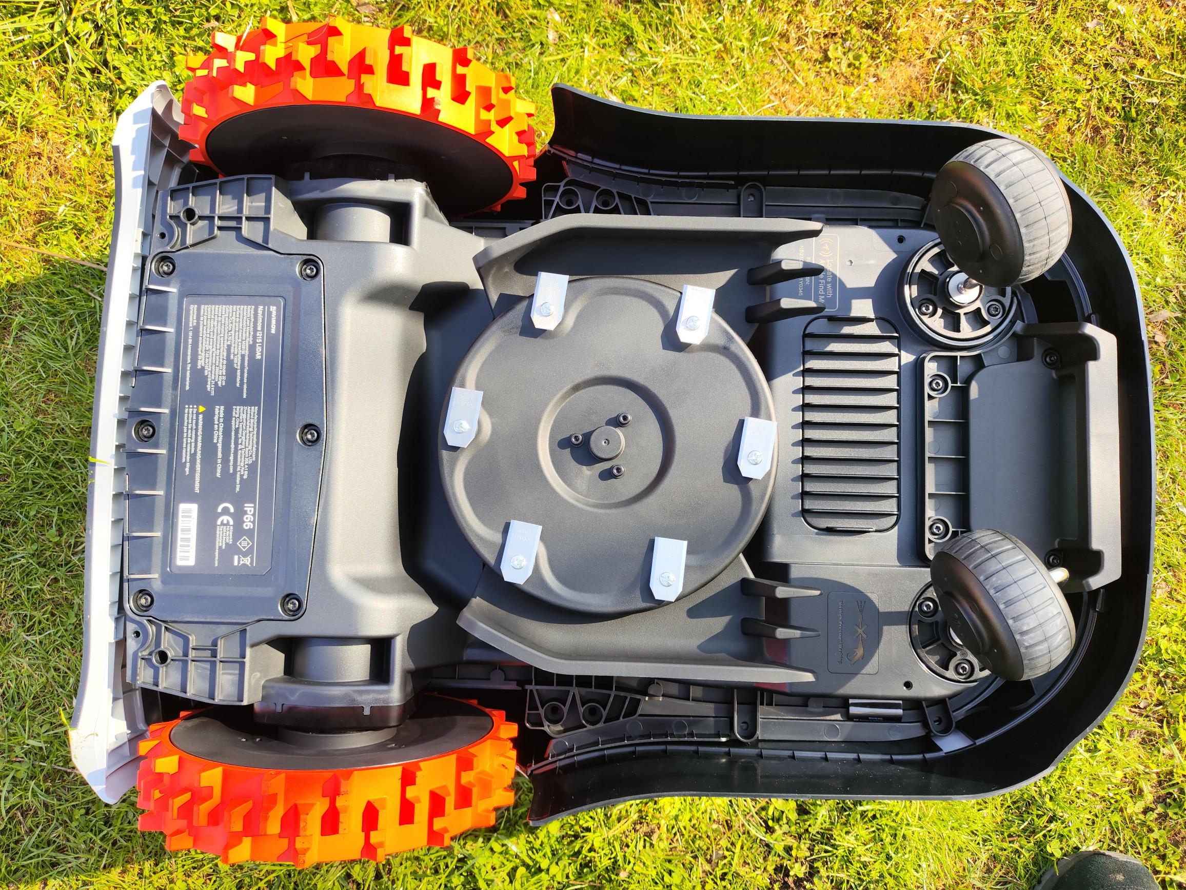 Die hinteren Räder haben einen Durchmesser von rund 20 Zentimetern und sind mit einem grobstolligen Geländeprofil besetzt. Dieses bietet selbst in losem Sand und nassem Gras einen sehr guten Grip. Die beiden Vorderräder sind drehend gelagert und lenken automatisch durch den Heckantrieb mit. Im hinteren Teil befindet sich unter der Schutzabdeckung der 165Wh (7,65Ah/21,6V) große Akku, der bei Bedarf für die Wintereinlagerung entnommen werden kann. Der Messerteller bietet eine Schnittbreite von 22 Zentimetern und ist mit 6 Klingen besetzt. Mit einer Breite von rund 45 Zentimetern ist der Mähroboter deutlich breiter als sein Messerteller. Somit bleiben selbst bei exakter Fahrt an der Grundstücksgrenze konstruktionsbedingt mindestens 12 Zentimeter ungemäht.