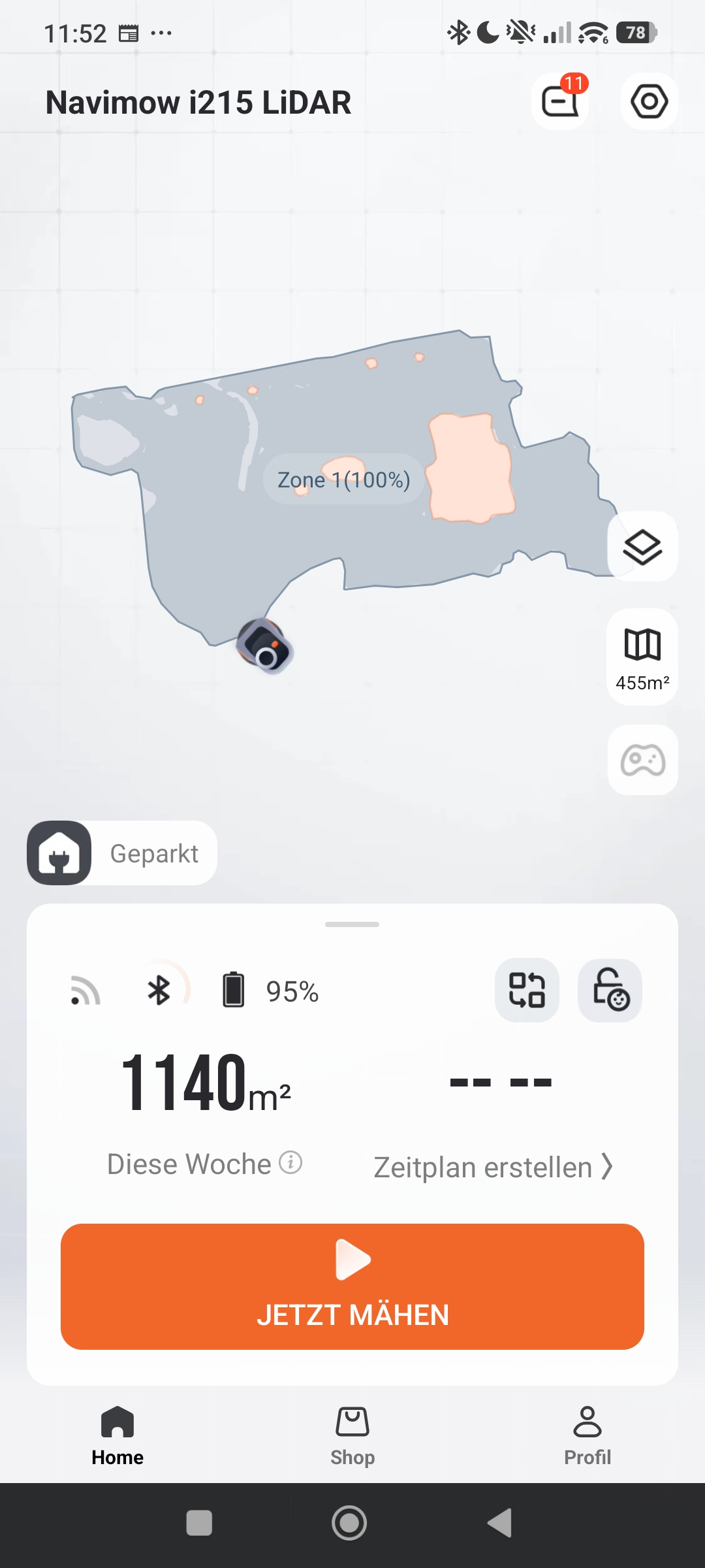 Der Navimow lässt sich innerhalb weniger Minuten mittels der Bluetooth-Suche hinzufügen. Nach der Einrichtung des heimischen WLANs und der ausstehenden Firmwareaktualisierungen könnt ihr die Erstkartierung durchführen. Verfügt eure Rasenfläche über klar definierte Grundstücksgrenzen (Borde, Mauern, Hecken), könnt ihr die automatische Kartierung starten. Mit dieser Funktion übernimmt der Navimow i215 LiDAR selbstständig alle Aufgaben und präsentiert euch am Ende eine vollständige Karte eurer Rasenfläche.
