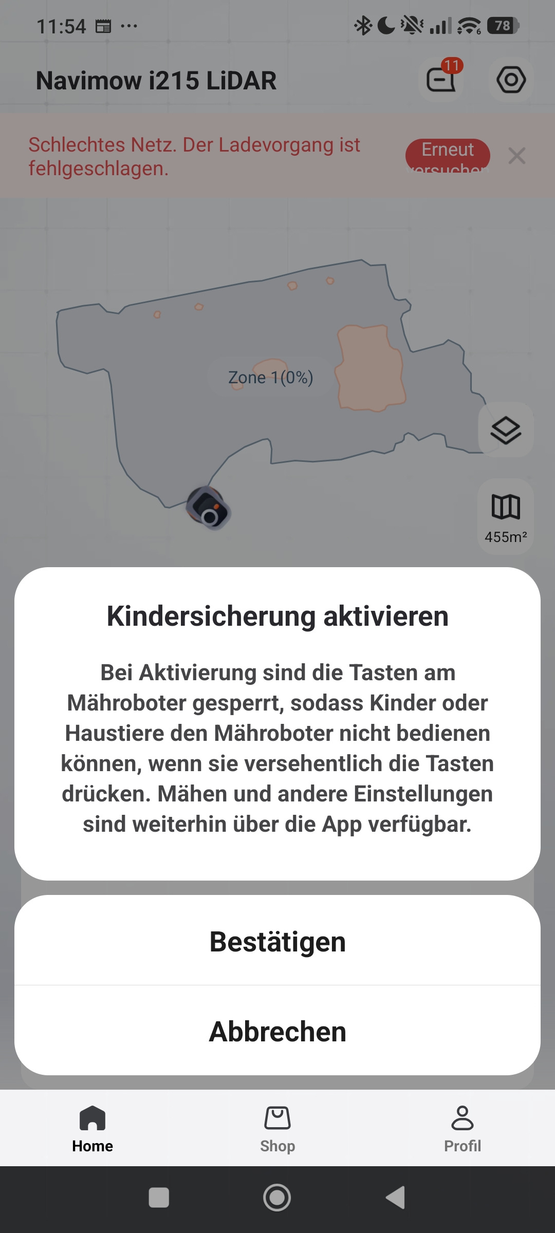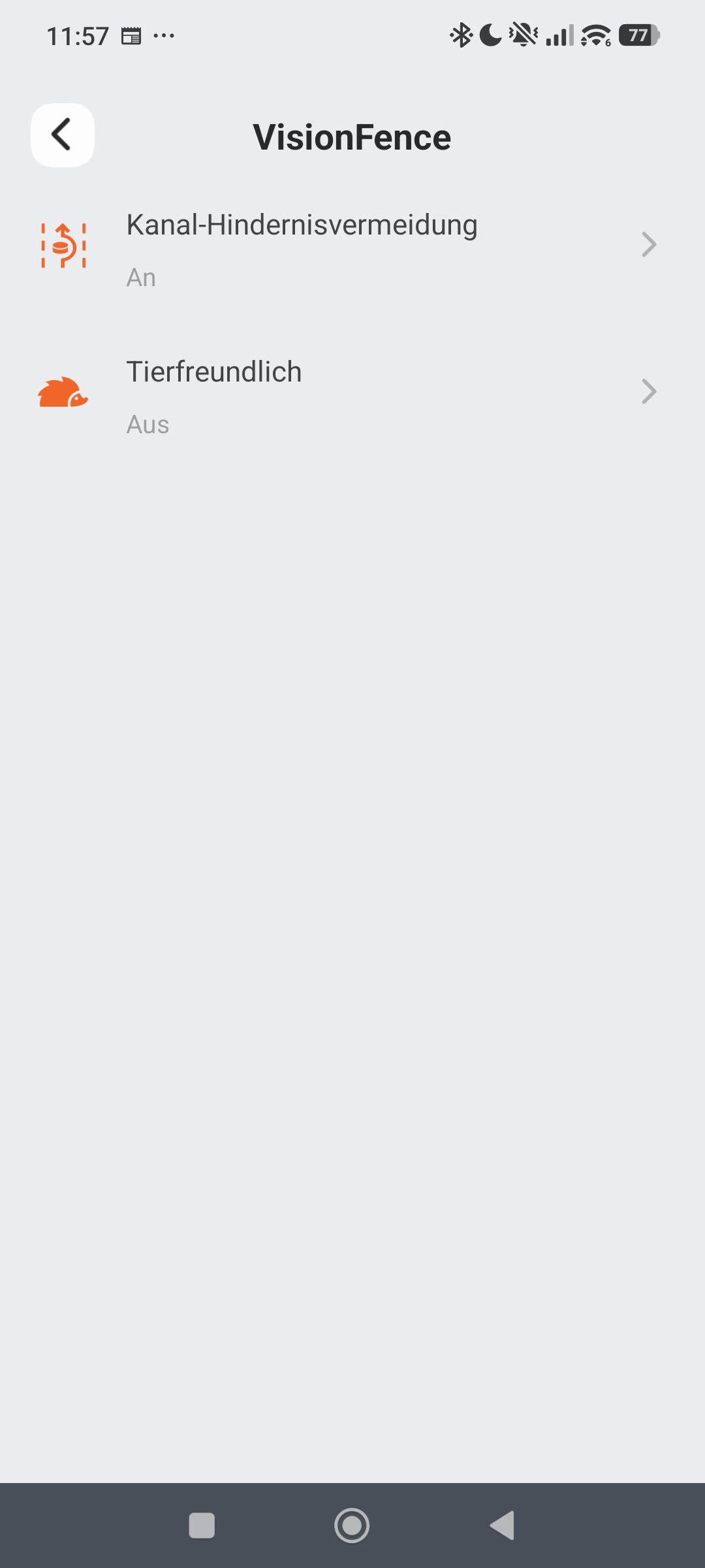Wie man sehen kann, sind die Konfigurationsmöglichkeiten wirklich umfangreich. Im Fernsteuerungsmodus kann der Mähroboter zum manuellen Mähen eingesetzt werden. Die drei Arbeitsmodi („Präzisionsmähen“, „Normales Mähen“, „Effizientes Mähen“) unterscheiden sich in Geschwindigkeit und Überlappung der einzelnen Bahnen. Somit wird auch die Arbeitsgeschwindigkeit beeinflusst. Unter dem Menüpunkt „Diebstahlschutz“ könnt ihr einen Alarm und eine Benachrichtigung auslösen, wenn der Roboter einen von euch definierten Bereich verlässt oder angehoben wird. Weiterhin sperrt sich der Navimow und ist erst nach Eingabe der PIN wieder verwendbar.