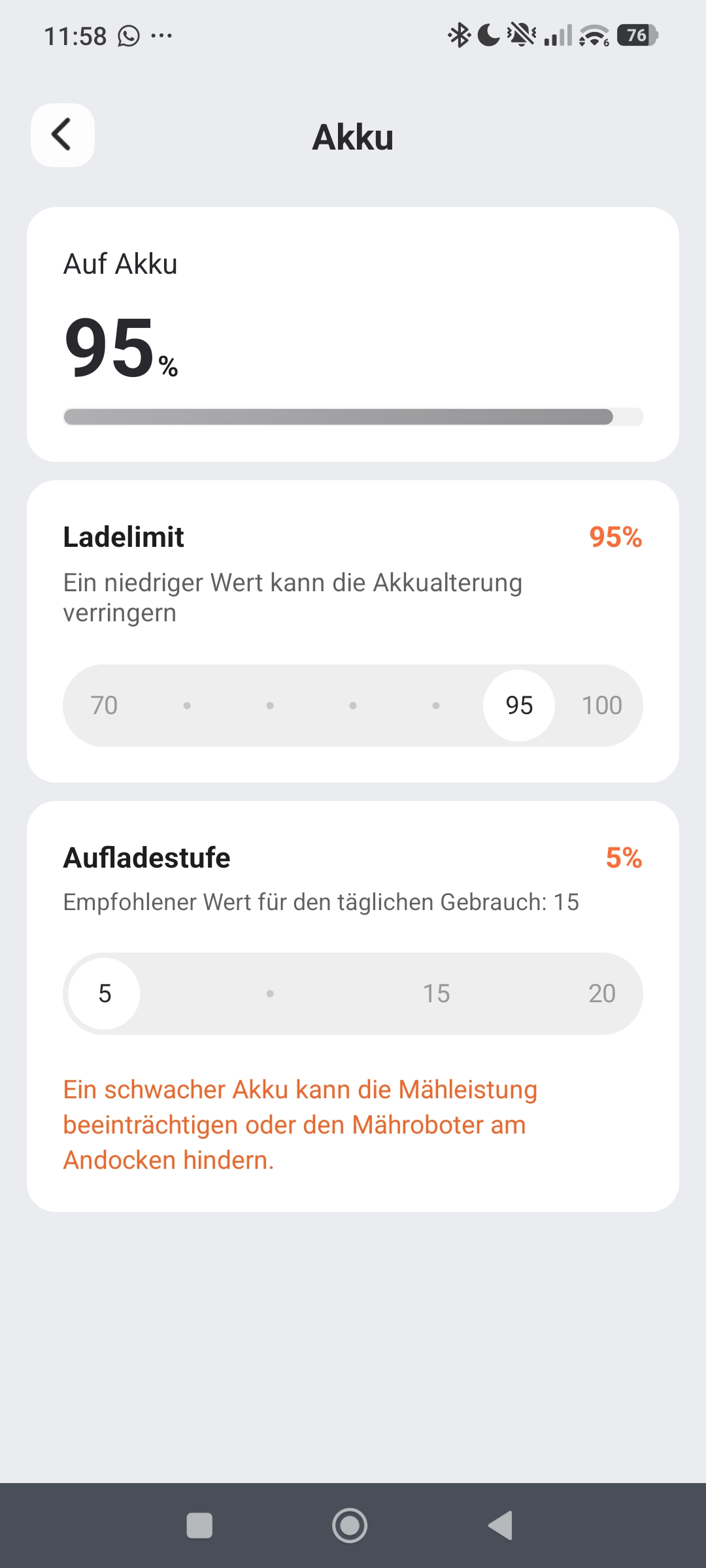 - Akkueinstellungen: untere (5-20%) und obere (70-100%) Ladegrenze festlegen