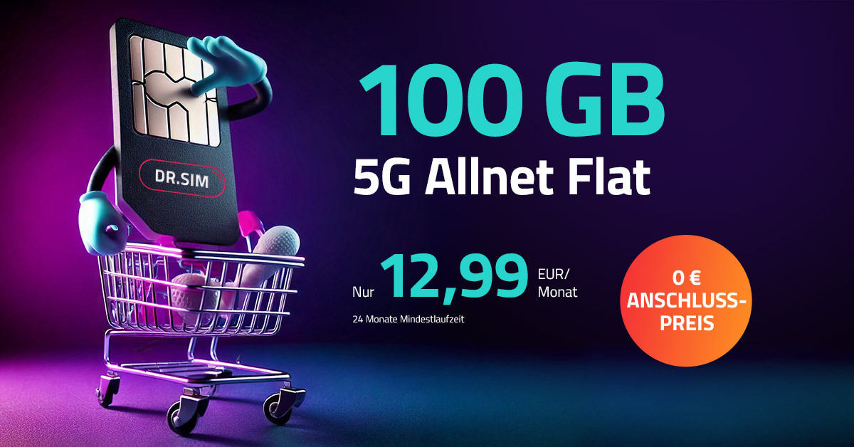 Allnet Flat 100 GB 5G | Flat Anrufe & SMS, 100 Gigabyte Datenvolumen | 0 Euro | 12,99 Euro | mindestens 24 Monate |